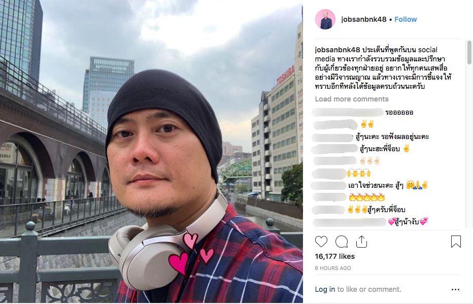 ล่าสุด จ๊อบซัง ณัฐพล บวรวัฒนะ ผู้จัดการวง BNK48 ได้โพสต์ภาพตัวเองพร้อมทั้งเขียนแคปชั่นเกี่ยวกับเรื่องที่เป็นประเด็นร้อนไว้ว่า “ประเด็นที่พูดกันบน social media ทางเรากำลังรวบรวมข้อมูลและปรึกษากับผู้เกี่ยวข้องทุกฝ่ายอยู่ อยากให้ทุกคนเสพสื่ออย่างมีวิจารณญาณ แล้วทางเราจะมีการชี้แจงให้ทราบอีกทีหลังได้ข้อมูลครบถ้วนนะครับ”
