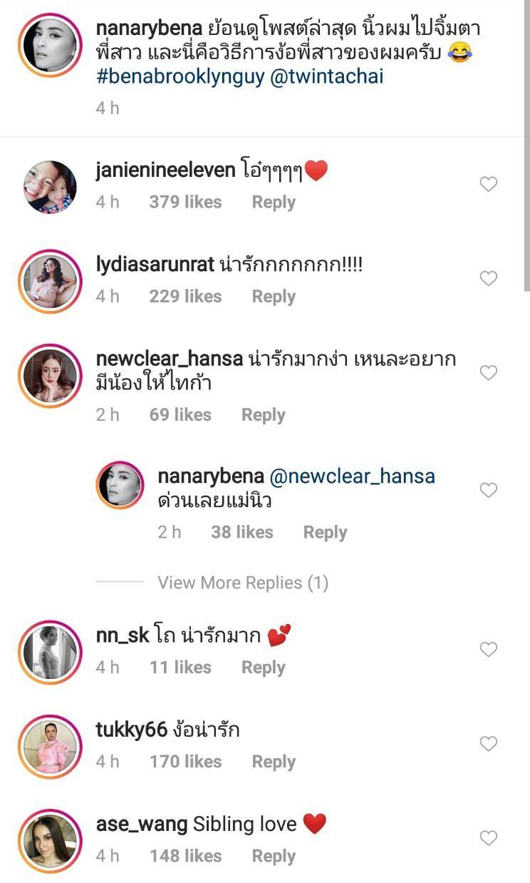 งานนี้คุณแม่นานาได้โพสต์คลิปตอนที่น้องบรู๊คลินตามง้อน้องบีน่าที่กำลังร้องไห้และเขียนข้อความว่า “ย้อนดูโพสต์ล่าสุด นิ้วผมไปจิ้มตาพี่สาว และนี่คือวิธีการง้อพี่สาวของผมครับ #benabrooklynguy @twintachai” โดยมีแฟนๆ เข้ามาแสดงความคิดเห็นกันหลายคน ส่วนใหญ่บอกว่าเป็นการง้อที่น่ารักมากๆ เห็นแล้วเขินแทน และจากคลิปนี้ทำให้คุณแม่คนใหม่อย่างนักร้องนักแสดงสาว นิวเคลียร์ หรรษา ถึงกับบอกว่า “น่ารักมากง่า เห็นละอยากมีน้องให้ไทก้า” จากนั้นนานาจึงตอบกลับว่า “ด่วนเลยแม่นิว”