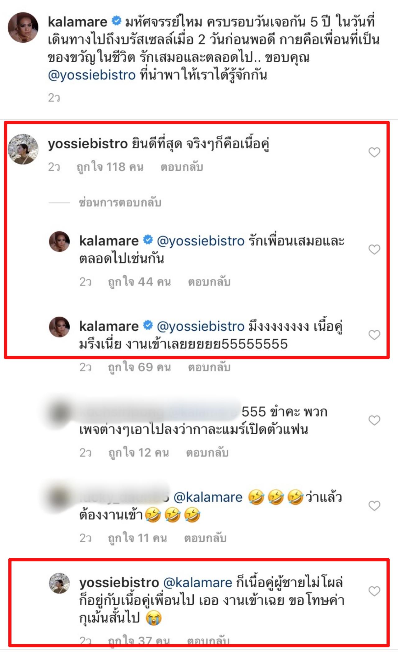 แต่ล่าสุด กาละแมร์ก็ได้ตอบข้อความจ๋าว่างานเข้าเพราะถูกแซวเรื่องเนื้อคู่ ซึ่งสาวจ๋าก็ได้เข้ามาคอมเมนต์ตอบว่า “ก็เนื้อคู่ผู้ชายไม่โผล่ ก็อยู่กับเนื้อคู่เพื่อนไป เออ งานเข้าเฉย ขอโทษค่า กุเม้นสั้นไป” เรียกว่าเคลียร์ชัดเจนว่าชายหนุ่มคนดังกล่าวเป็นแค่เพื่อน ไม่มีอะไรในกอไผ่นะจ๊ะ