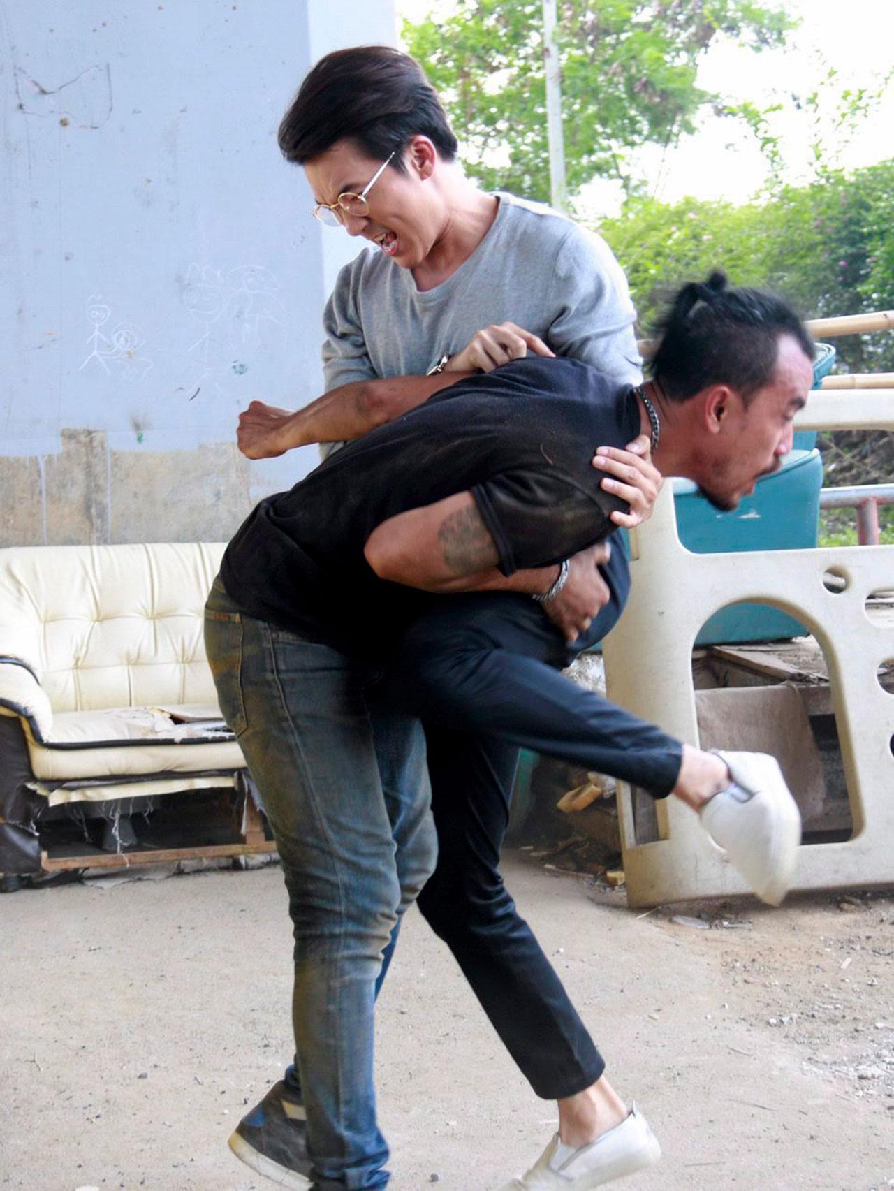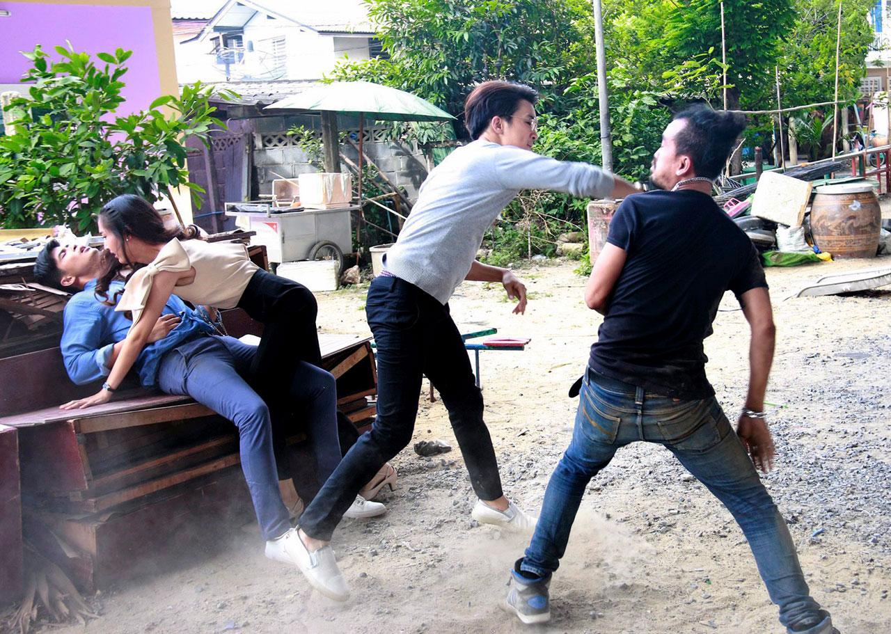 ฉากนี้ถ่ายที่ชุมชนบึงพระรามเก้า ปกติ ตูมตาม บู๊เดี่ยวโชว์นางเอกตลอด ครั้งนี้ขอเปิดโอกาสให้ บอส-แบงค์ ได้โชว์บ้าง และด้วยความที่เป็นฉากบู๊หมู่มวลเกรงว่าจะเกิดผิดคิวจึงใช้เวลาซักซ้อมคิวนานหน่อย พอเริ่มถ่ายจริง ตูมตาม เปิดเกมด้วยการถีบและเข่าลอยใส่จิ๊กโก๋ก่อน แต่โชว์ได้ไม่กี่สเต็ปก็ถูกแทง จากนั้นจึงเป็นคิว แซนดี้ รีบเข้าไปช่วยโดยยอมเอาตัวเข้าบัง แบงค์ ก็เข้ามาช่วยอีกคนกระโดดถีบจิ๊กโก๋กระเด็นแล้วตีเข่าปั๊กๆ ก่อนที่จิ๊กโก๋จะพร้อมใจหันมาบาทาสามัคคีใส่ แบงค์ จนเจ้าตัวเหวี่ยงเท้าสาวหมัดใส่คู่ต่อสู้แบบรอบทิศจนแทบหมดแรงอยู่รอมร่อ ดีที่ บอส โผล่มาปิดจ๊อบเริ่มด้วยจระเข้ฟาดหาง เหงื่อยังไม่ทันซึมเลยก็ควักปืนออกมาเก๊กท่าหล่อๆจิ๊กโก๋ก็เพ่นแน่บ!...