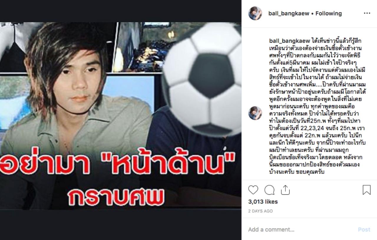หลังจากที่ บอล บางแก้ว หรือ บอล พงษ์เพชร สินสุวรรณ์ ได้ออกมาชี้แจงเกี่ยวกับข่าวลือเรื่องการยัดเงินให้พ่อของ เบนซ์ แฟนสาวของตนเองที่ตายปริศนาในบ้านของตนเอง ล่าสุด บอล ก็ได้ออกมาเขียนระบายความในใจอีกครั้ง หลังมีภาพข่าวเขียนว่า อย่ามา "หน้าด้าน" กราบศพ โดย บอล ได้บอกว่า ทุกเรื่องที่ตนพูดมานั้นเป็นเรื่องจริงทั้งหมด