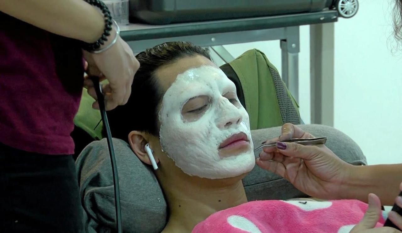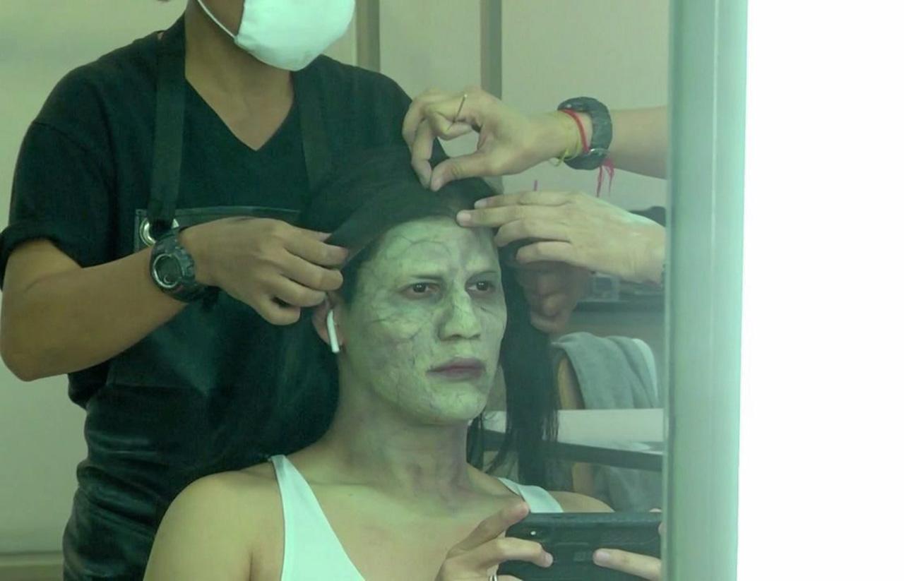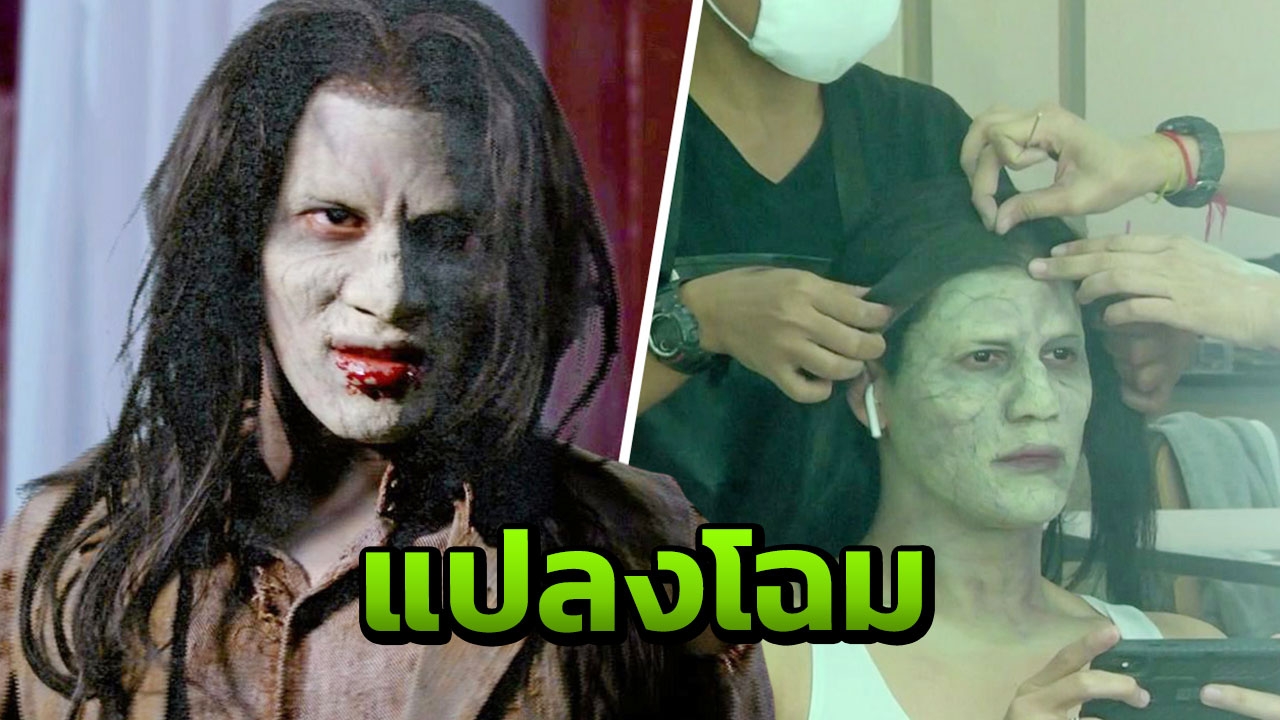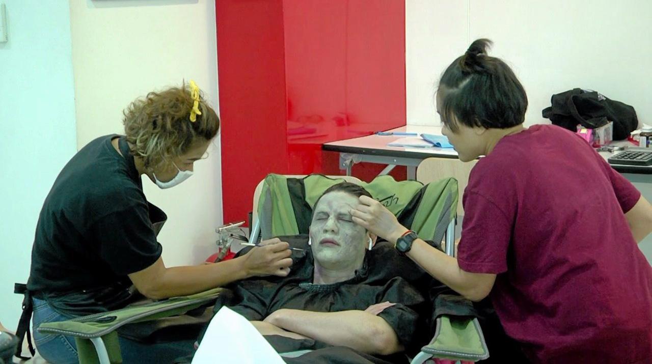 จากนั้นก็นำชิ้นส่วนต่างๆมาแปะที่ใบหน้า รอให้ยางพาราแห้งสนิท แล้วก็มาถึงขั้นตอนเก็บรายละเอียดเมกอัป พ่นสีสเปรย์ที่ผิวหน้า ใส่คอนแทกเลนส์ เพื่อเสริมความน่ากลัว และปิดท้ายด้วยการใส่วิกผมยาวเพื่อเปลี่ยนลุคให้น่ากลัวขึ้นไปอีก หลังจากแต่งหน้าจนเสร็จแล้ว หนุ่มซีก็เริ่มถ่ายทำทันที ถึงแม้หน้าจะถูกโบก ถูกทับ ขยับก็ลำบาก แต่ด้วยสปิริตนักแสดง ซี ไม่มีปริปากบ่นสักคำ นี่เป็นเพียงแค่เรียกน้ำจิ้มบางส่วนเท่านั้น