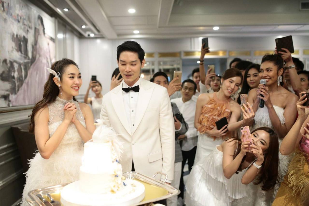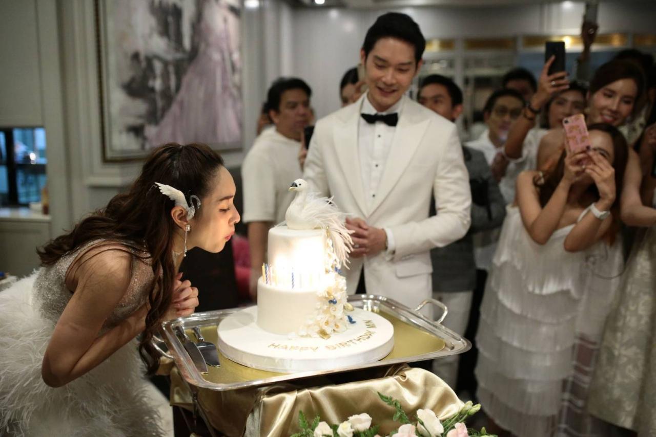 แต่สิ่งที่ทำเอาแฟนๆ หลายคนฮือฮาคือชุดที่สาวมินสวมใส่กับชุดราตรียาวสีขาวกระโปรงสุ่มปักขนนกทั้งตัว ส่วนหนุ่มโอ๊ตก็มาในชุดสูทสีขาวเรียบหรูดูดี โดยมีภาพปรากฏขณะทั้งคู่ยืนอยู่หน้าเค้กก้อนโตภายในงานเลี้ยง จนแฟนๆ หลายคนแซวกันยกใหญ่ว่าบรรยากาศเหมือนงานแต่งงาน