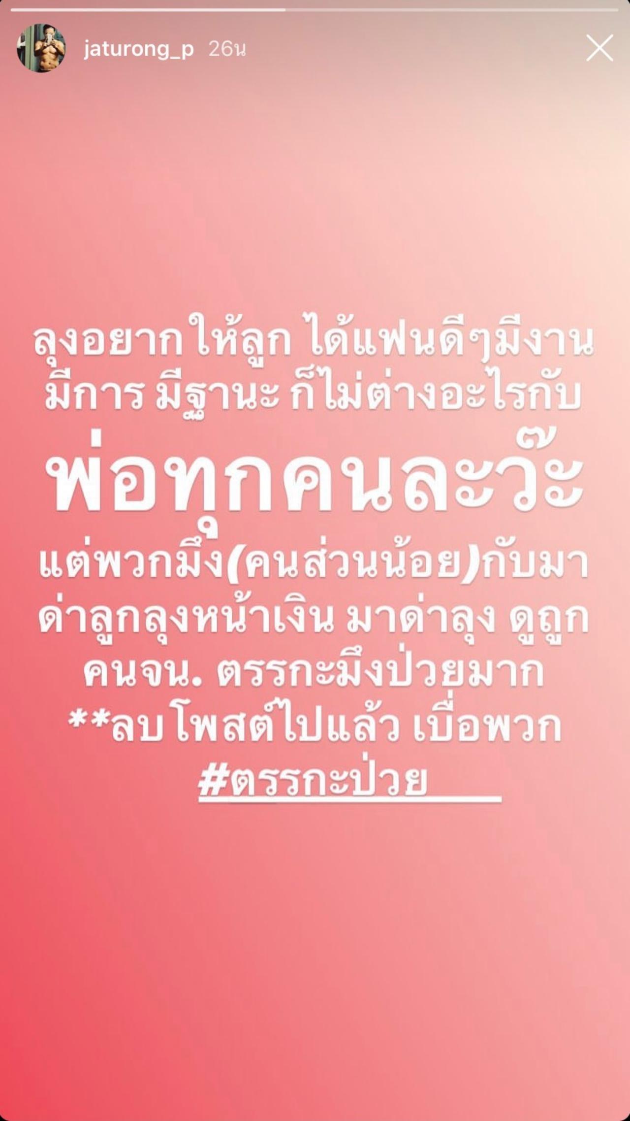 “ลุงอยากให้ลูกได้แฟนดีๆ มีงานมีการมีฐานะ ก็ไม่ต่างอะไรกับพ่อทุกคนละวะ แต่พวกมึง (คนส่วนน้อย) กลับมาด่าลูกลุงหน้าเงิน มาด่าลุง ดูถูกคนจน ตรรกะมึงป่วยมา **ลบโพสต์ไปแล้ว เบื่อพวก #ตรรกะป่วย”