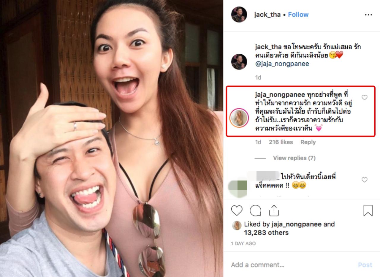 ส่วนทางด้าน แจ๊ค ก็ได้โพสต์รูปพร้อมข้อความขอโทษ จ๊ะ ผ่านอินสตาแกรม ซึ่งชัดเจนแล้วว่าทั้งคู่กำลังงอนกันจริงๆ โดย แจ๊ค เขียนแคปชั่นว่า "ขอโทษนะครับ รักแม่เสมอ รักคนเดียวด้วย ดีกันนะลิงน้อย" ซึ่งก็มีแฟนคลับที่ติดตาม ต่างเชียร์ให้ แจ๊ค รีบไปง้อ จ๊ะ ที่หัวหิวแบบด่วนๆ