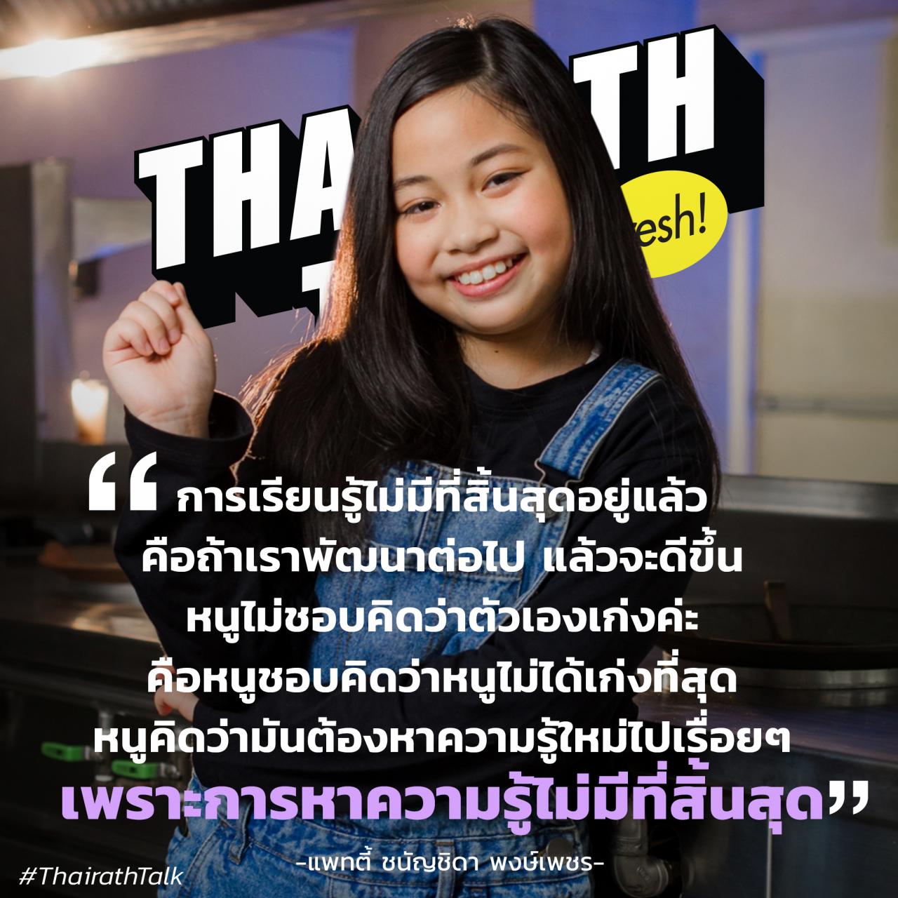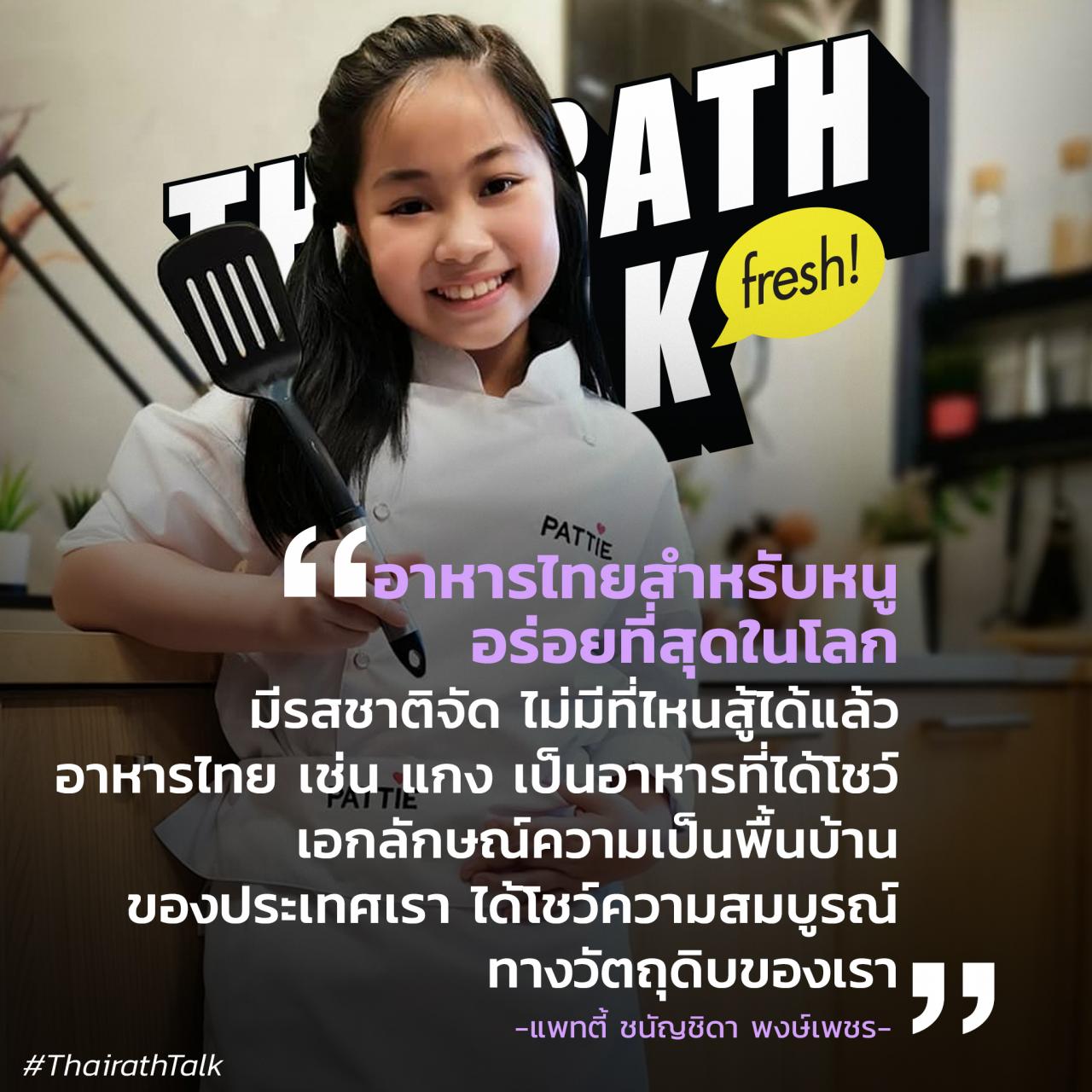 Thairath Talk Fresh มีโอกาสได้พูดคุยกับสาวน้อยวัย 11 ปี มากความสามารถ จะเรียกว่าเก่งเกินตัวก็ไม่ผิด และยังมีตำแหน่งเป็นถึงมาสเตอร์เชฟจูเนียร์ประเทศไทยคนแรก แพทตี้ เชฟ มาสเตอร์เชฟ จูเนียร์ประเทศไทยคนแรก (Masterchef Junior Thailand) มาพร้อมความสดใส เล่าความฝัน ให้แรงบันดาลใจ และวิธีแก้ไขขณะอยู่ในรายการ