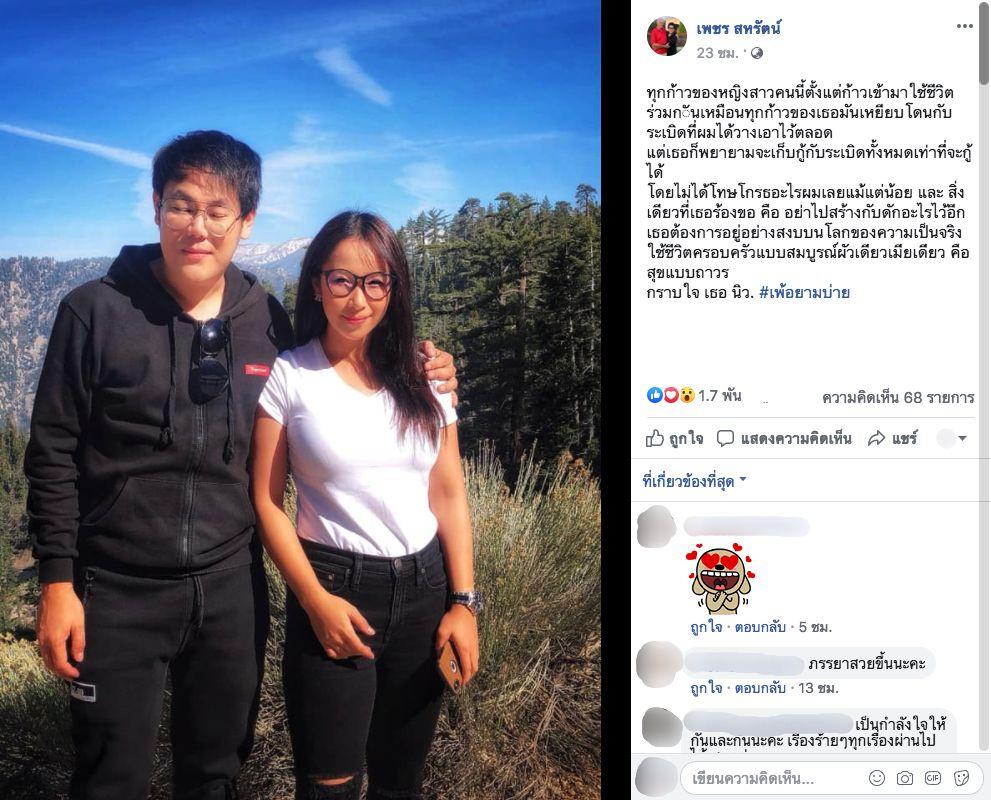นอกจากนี้เพชรยังได้โพสต์ภาพคู่กับนินิวอีกภาพ พร้อมทั้งเขียนข้อความว่า “ทุกก้าวของหญิงสาวคนนี้ตั้งแต่ก้าวเข้ามาใช้ชีวิตร่วมกันเหมือนทุกก้าวของเธอมันเหยียบโดนกับระเบิดที่ผมได้วางเอาไว้ตลอด แต่เธอก็พยายามจะเก็บกู้กับระเบิดทั้งหมดเท่าที่จะกู้ได้ โดยไม่ได้โทษโกรธอะไรผมเลยแม้แต่น้อย และสิ่งเดียวที่เธอร้องขอ คือ อย่าไปสร้างกับดักอะไรไว้อีก เธอต้องการอยู่อย่างสงบบนโลกของความเป็นจริง ใช้ชีวิตครอบครัวแบบสมบูรณ์ผัวเดียวเมียเดียว คือ สุขแบบถาวร กราบใจเธอ นิว. #เพ้อยามบ่าย” และมีแฟนๆ เข้ามาคอมเมนต์ชื่นชม พร้อมทั้งบอกว่าเจอคนดีๆ แล้วก็รักษาไว้ด้วย.