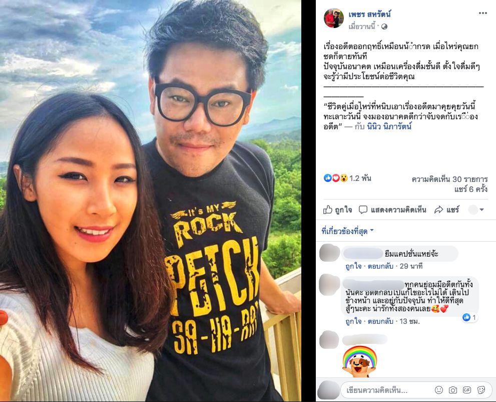 โดยเพชรโพสต์ภาพคู่กับนินิวพร้อมทั้งเขียนข้อความบรรยายว่า “เรื่องอดีตออกฤทธิ์เหมือนน้ำกรด เมื่อไหร่คุณยกซดก็ตายทันที ปัจจุบันอนาคต เหมือนเครื่องดื่มชั้นดี ตั้งใจดื่มดีๆ จะรู้ว่ามีประโยชน์ต่อชีวิตคุณ ชีวิตคู่เมื่อไหร่ที่หยิบเอาเรื่องอดีตมาคุย คุยวันนี้ทะเลาะวันนี้ จงมองอนาคตดีกว่าจับจดกับเรื่องอดีต” โดยมีแฟนๆ เข้ามาคอมเมนต์ชื่นชมให้กำลังใจหลายคน แต่บางคนก็อดสงสัยแคปชั่นที่พูดถึงน้ำกรดว่าต้องการสื่อถึงอะไร นอกจากนี้มีแฟนๆ บางคนเข้ามาถามว่า “เฮียทำไมเปรียบผู้หญิงเป็นน้ำชาละเฮีย กินง่ายเหรอ” ซึ่งเพชรได้ตอบกลับว่า “เขาเปรียบเรื่องอดีตคน ไม่ได้พูดถึงเรื่องผู้หญิง”
