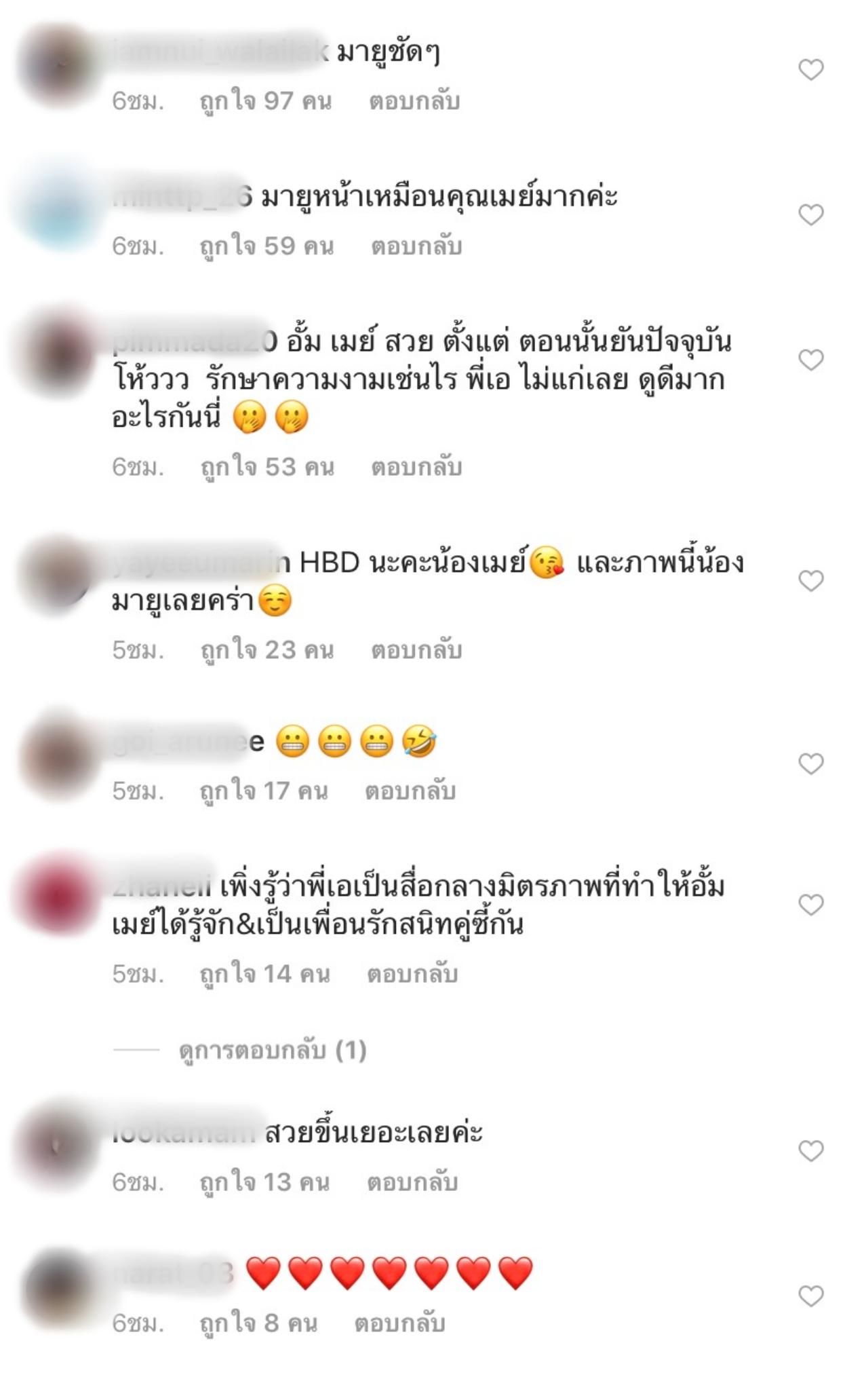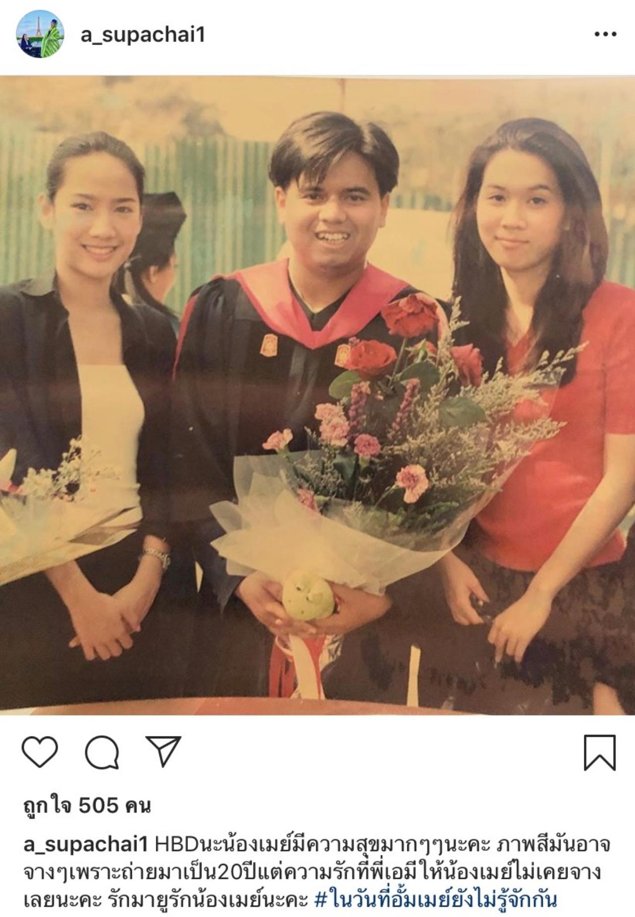 ซึ่งภาพนั้นเป็นภาพที่นางเอกซุป'ตาร์ อั้ม พัชราภา ไชยเชื้อ และ เมย์ ปทิดา ไปร่วมแสดงความยินดีกับพี่เอที่งานรับปริญญา ซึ่งตอนนั้น 2 สาว อั้มและเมย์ ยังไม่รู้จักกัน และที่สำคัญทั้งอั้มและเมย์ยังเป็นสาววัยรุ่นใสๆ ซึ่งเป็นภาพที่หาดูได้ยากมากๆ ของอั้มและเมย์ แถมงานนี้เมื่อชาวเน็ตได้เห็นรูปดังกล่าวก็แห่คอมเมนต์บอกน้องมายูหน้าเหมือนสาวเมย์สมัยตอนที่เป็นวัยรุ่นมากๆ อีกด้วย.