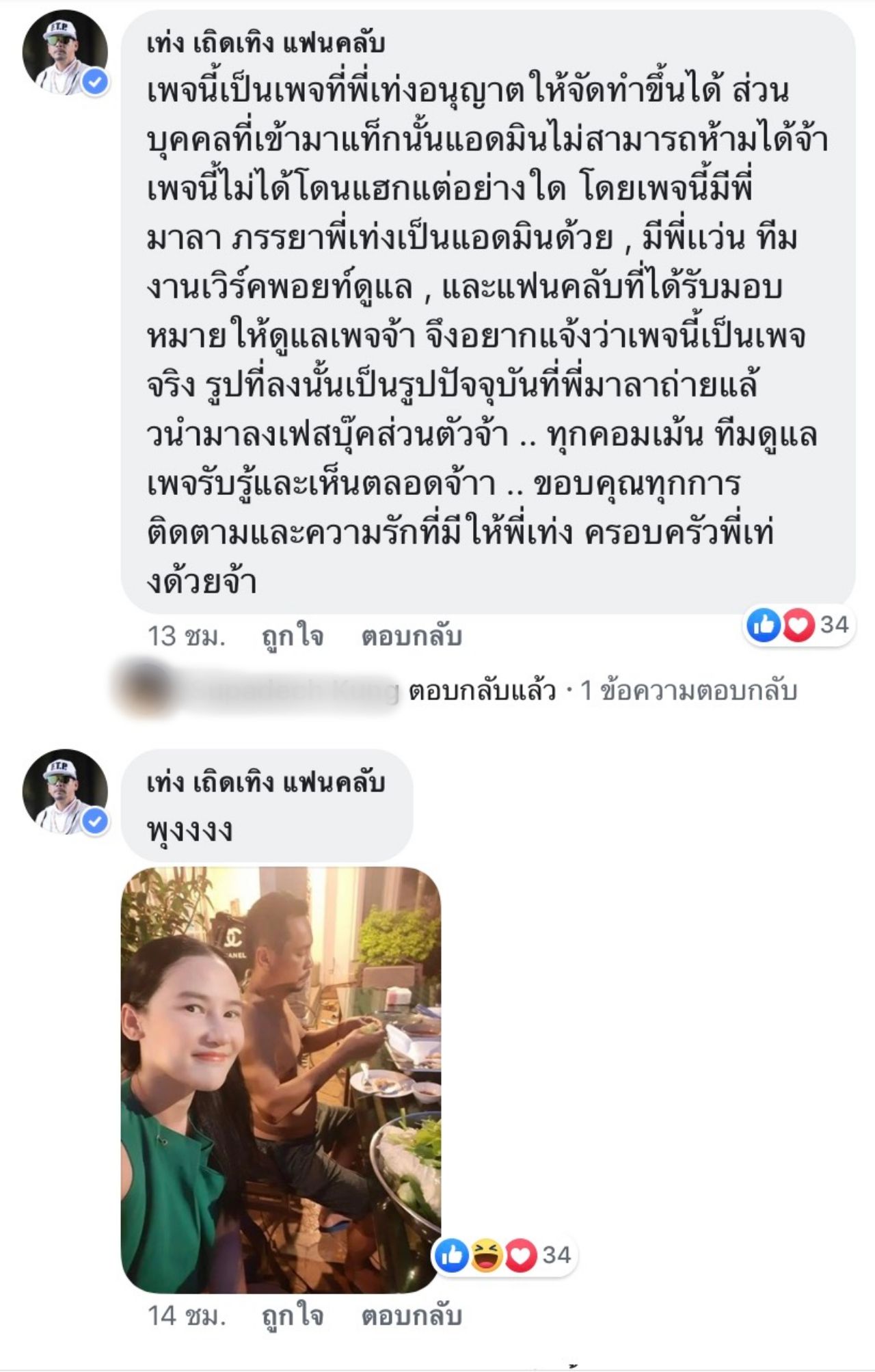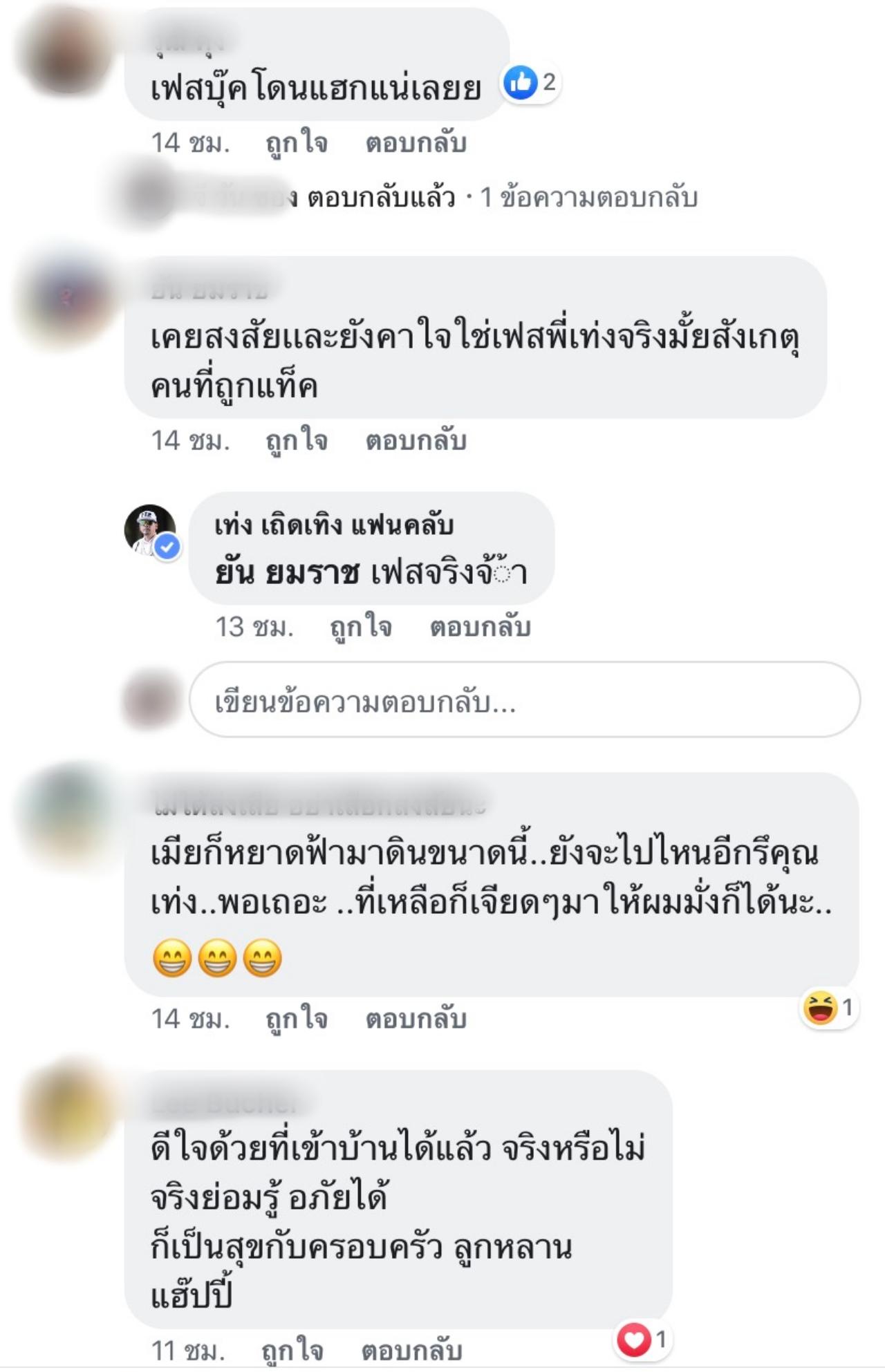 จนกระทั่งรูปล่าสุด ที่เป็นการปาร์ตี้ชาบูที่บ้าน โดยภรรยาของเท่งได้โพสต์รูปลงในอินสตาแกรม จนกลายเป็นข่าวว่าทั้งคู่ได้กลับมาคืนดีกันนั้น แต่ในเฟซบุ๊ก เท่ง เถิดเทิง แฟนคลับ กลับมองว่าเฟซดังกล่าวน่าจะถูกแฮกและมีคนเอารูปเก่าของเท่งและภรรยามาโพสต์ งานนี้แอดมินเพจเลยได้รีบออกมาชี้แจงว่ารูปที่โพสต์ลงในเฟซบุ๊กนี้เป็นภาพปัจจุบันและไม่ได้ถูกแฮกแต่อย่างใด