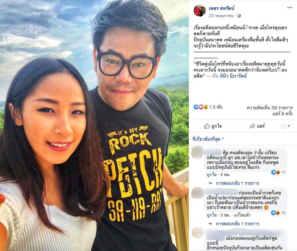 กลายเป็นกระแสดราม่าจนได้ เมื่อนักร้องนักแต่งเพลงลูกทุ่งดัง เพชร สหรัตน์ โพสต์ภาพคู่กับหวานใจ นินิว นิภารัตน์ และเขียนแคปชั่นว่า “เรื่องอดีตออกฤทธิ์เหมือนน้ำกรด เมื่อไหร่คุณยกซดก็ตายทันที ปัจจุบันอนาคตเหมือนเครื่องดื่มชั้นดี ตั้งใจดื่มดีๆ จะรู้ว่ามีประโยชน์ต่อชีวิตคุณ”