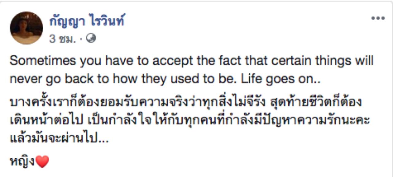 และล่าสุด สาวหญิงได้แชร์ข่าวรักร้าวของตนเองและสามี พร้อมข้อความลงในเฟซบุ๊กที่ใช้ชื่อว่า กัญญา ไรวินท์ อีกด้วย โดยมีข้อความระบุว่า “Sometimes you have to accept the fact that certain things will never go back to how they used to be. Life goes on..บางครั้งเราก็ต้องยอมรับความจริงว่าทุกสิ่งไม่จีรัง สุดท้ายชีวิตก็ต้องเดินหน้าต่อไป เป็นกำลังใจให้กับทุกคนที่กำลังมีปัญหาความรักนะคะ แล้วมันจะผ่านไป...หญิง”