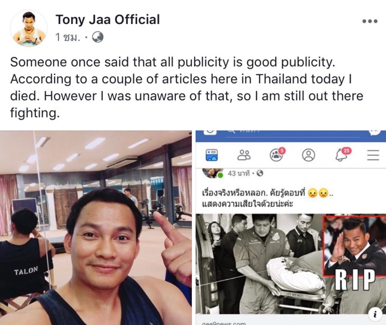 ทำเอาแฟนๆ ถึงกับตกอกตกใจ เมื่อมีเพจข่าวปล่อยข่าวนักแสดงนักบู๊ จา พนม หรือ โทนี่ จา เสียชีวิตแล้ว พร้อมนำศพกลับจังหวัดสุรินทร์บ้านเกิด ซึ่งข่าวดังกล่าว ทำเอาเจ้าตัวถึงกับต้องออกมาชี้แจงเป็นการด่วนว่า
