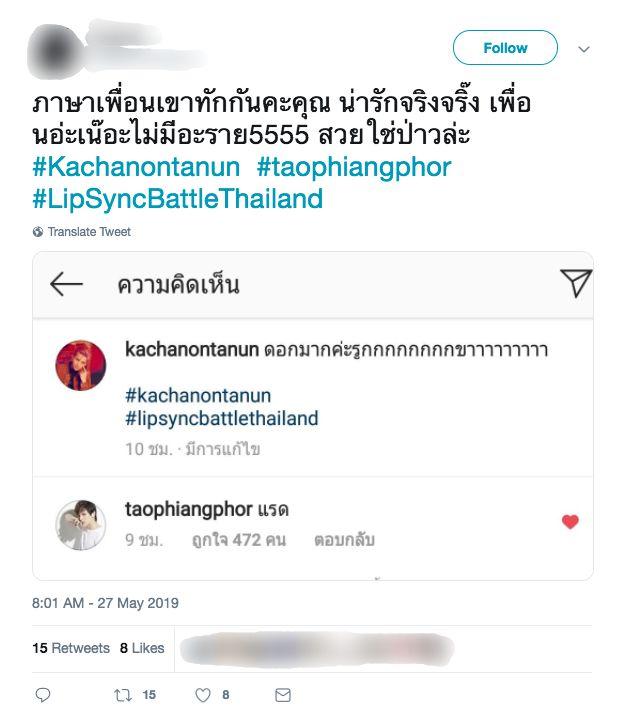 และดูเหมือนคชาเองก็จะถูกใจไม่น้อยเมื่อได้แปลงโฉมเป็นเจนนี่ โพสต์ภาพดังกล่าวลงไอจีส่วนตัวและเขียนข้อความว่า “ดอกมากค่ะรูกกกกกกกกขาาาาาาาาา #kachanontanun #lipsyncbattlethailand” งานนี้เลยเจอเพื่อนซี้นักร้องเอเอฟอย่าง เต๋า เศรษฐพงษ์ แซวว่า "แรด" ด้วย