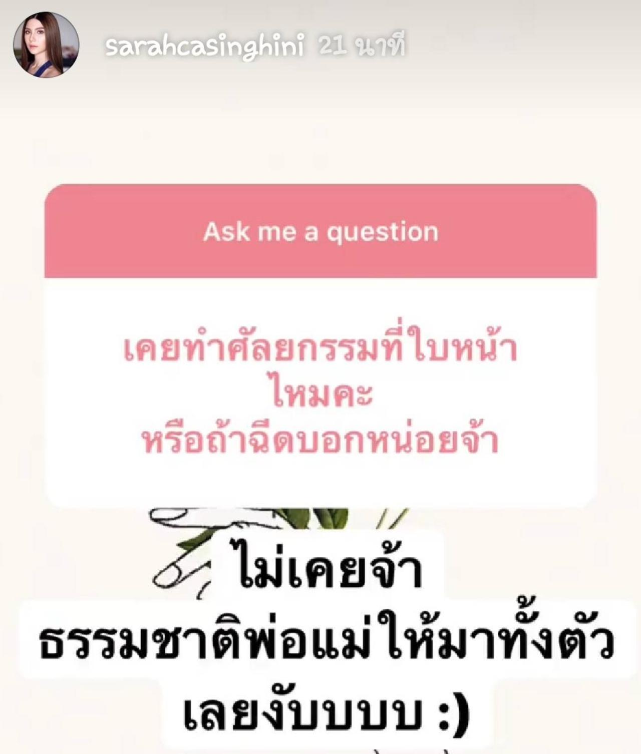 โดยสาวซาร่า เล่นถามตอบกับเพื่อนๆ แฟนๆ ผ่านทางไอจีสตอรี่ และสาวซาร่าถูกถามว่า เคยทำศัลยกรรมที่ใบหน้าไหมคะ หรือถ้าฉีดบอกหน่อยจ้า ซึ่งสาวซาร่าก็ตอบคำถามเรื่องนี้ว่า “ไม่เคยจ้า ธรรมชาติพ่อแม่ให้มาทั้งตัวเลยงับบบบ :)” สาวซาร่าเคลียร์ชัดเจนขนาดนี้ว่าที่เห็นสวยๆ นี้ พ่อแม่ให้มา ไม่เคยทำอะไรทั้งนั้น หายสงสัยกันแล้วใช่มั้ย