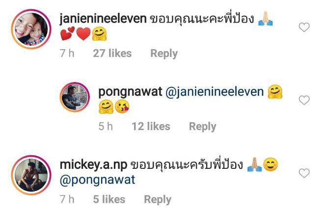 โดยป้องโพสต์ภาพคู่กับเจนี่ รวมไปถึงภาพกับเจนี่และนางเอกสาวฮอต เบลล่า ราณี แคมเปน เมื่อตอนเล่นละคร "เพลิงบุญ" ด้วยกัน พร้อมทั้งเขียนข้อความว่า “Big congrats on this wonderful news ดีใจด้วยน้า ใจเริงของเฮีย หลานมาอีกคนแล้ว แข็งแรงทั้งคุณแม่ คุณลูกน้า #เพลิงบุญ2017” และเจนี่กับมิกกี้คอมเมนต์ขอบคุณหนุ่มป้อง