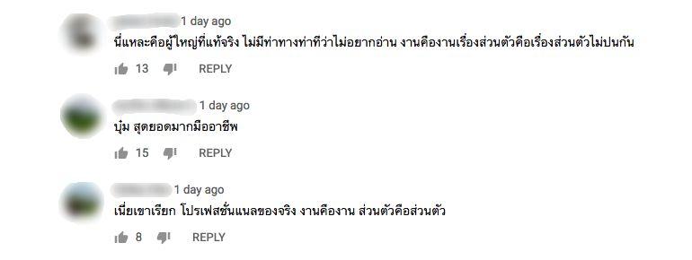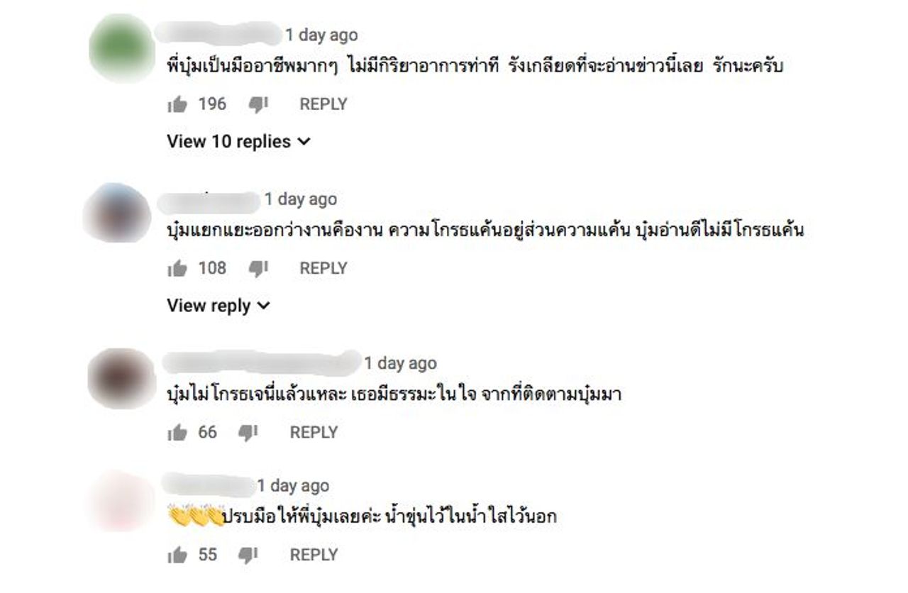 ซึ่งหลังจากที่รายการดังกล่าวออนแอร์ไป ก็มีชาวเน็ตแสดงความชื่นชมว่าบุ๋มเป็นมืออาชีพมาก มีความเป็นผู้ใหญ่ ไม่มีกิริยาอาการรังเกียจที่จะอ่านข่าวนี้ แยกแยะออกงานคืองาน เรื่องส่วนตัวคือเรื่องส่วนตัว อ่านดีไม่มีโกรธแค้น บ้างก็เชื่อว่าบุ๋มคงไม่ได้โกรธอะไรเจนี่แล้วเพราะมีธรรมะในใจ มีวุฒิภาวะดีมาก ฯลฯ.