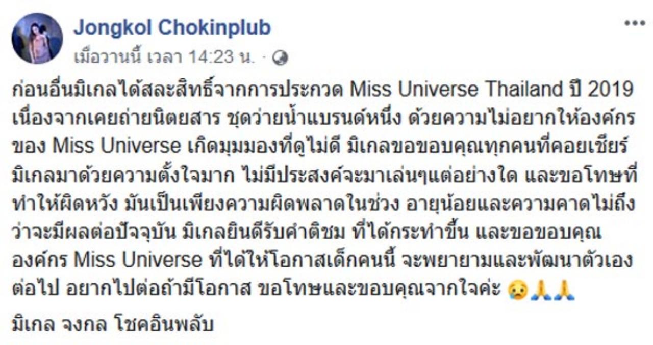 แม้จะได้เข้ารอบ 60 คนไปแล้ว แต่ มิเกล จงกล โชคอินพลับ 1 ในสาวงามผู้เข้ารอบได้ออกมาประกาศถอนตัวผ่านทางเฟซบุ๊กส่วนตัว โดยมีข้อความว่า "ก่อนอื่นมิเกลได้สละสิทธิ์จากการประกวด Miss Universe Thailand ปี 2019 เนื่องจากเคยถ่ายนิตยสารชุดว่ายน้ำแบรนด์หนึ่ง