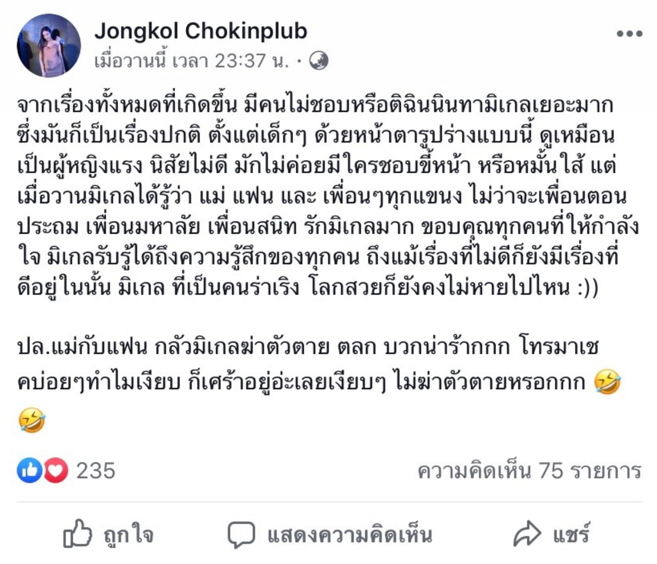 แต่เมื่อวานมิเกลได้รู้ว่า แม่ แฟน และเพื่อนๆ ทุกแขนง ไม่ว่าจะเพื่อนตอนประถม เพื่อนมหา'ลัย เพื่อนสนิท รักมิเกลมาก ขอบคุณทุกคนที่ให้กำลังใจ มิเกลรับรู้ได้ถึงความรู้สึกของทุกคน ถึงแม้เรื่องที่ไม่ดีก็ยังมีเรื่องที่ดีอยู่ในนั้น มิเกล ที่เป็นคนร่าเริง โลกสวยก็ยังไม่หายไปไหน