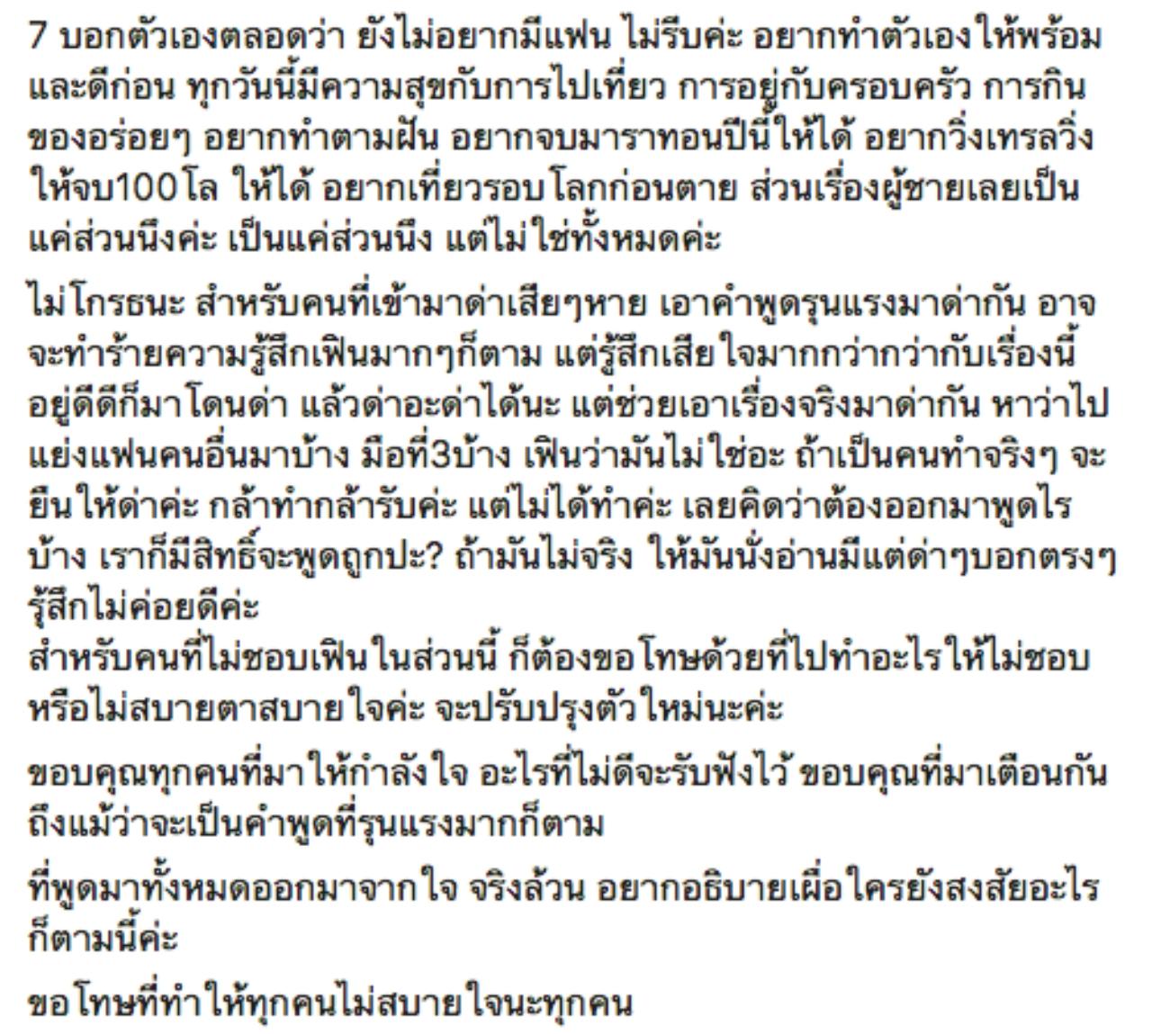 ไม่โกรธนะ สำหรับคนที่เข้ามาด่าเสียๆ หายๆ เอาคำพูดรุนแรงมาด่ากัน อาจจะทำร้ายความรู้สึกเฟินมากๆ ก็ตาม แต่รู้สึกเสียใจมากกว่ากับเรื่องนี้ อยู่ดีๆ ก็มาโดนด่า แล้วด่าอะด่าได้นะ แต่ช่วยเอาเรื่องจริงมาด่ากัน หาว่าไปแย่งแฟนคนอื่นมาบ้าง มือที่3 บ้าง เฟินว่ามันไม่ใช่อะ ถ้าเป็นคนทำจริงๆ จะยืนให้ด่าค่ะ กล้าทำกล้ารับค่ะ แต่ไม่ได้ทำค่ะ เลยคิดว่าต้องออกมาพูดไรบ้าง เราก็มีสิทธิ์จะพูดถูกปะ? ถ้ามันไม่จริง ให้มันนั่งอ่านมีแต่ด่าๆ บอกตรงๆ รู้สึกไม่ค่อยดีค่ะ