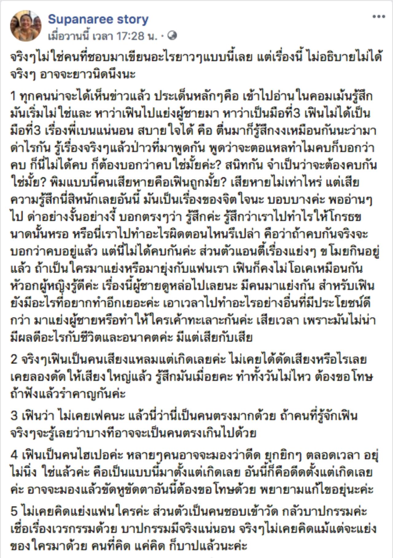 1. ทุกคนน่าจะได้เห็นข่าวแล้ว ประเด็นหลักๆ คือ เข้าไปอ่านในคอมเมนต์รู้สึกมันเริ่มไม่ใช่ละ หาว่าเฟินไปแย่งผู้ชายมา หาว่าเป็นมือที่ 3 เฟินไม่ได้เป็นมือที่ 3 เรื่องพี่เบนแน่นอน สบายใจได้ คือ ตื่นมาก็รู้สึกงงเหมือนกันนะว่ามาด่าไรกัน รู้เรื่องจริงๆ แล้วเปล่าที่มาพูดกัน พูดว่า จะตอแหลทำไมคบก็บอกว่าคบ ก็นี่ไม่ได้คบ ก็ต้องบอกว่าคบใช่มั้ยคะ?