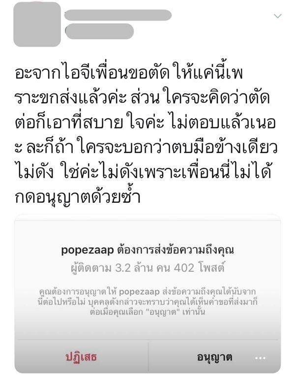 นอกจากนี้ยังมีผู้ใช้ทวิตเตอร์บางคนโพสต์ภาพที่อ้างว่าเป็นภาพแคปจากตอนที่หนุ่มโป๊ปไดเร็กข้อความในไอจีมา พร้อมทั้งเขียนข้อความว่าเอามาจากไอจีเพื่อน ขอตัดให้เหลือแค่นี้ ส่วนใครจะคิดว่าตัดต่อก็เอาที่สบายใจ และถ้าใครจะบอกว่าตบมือข้างเดียวไม่ดังก็ใช่ ไม่ดังเพราะเพื่อนไม่ได้กดอนุญาตด้วยซ้ำ บ้างก็บอกว่าเพื่อนตนก็โดนเหมือนกัน ตอนแรกไม่เชื่อข่าว แต่พอเพื่อนโดนนี่เชื่อหมดใจ ปัจจุบันเพื่อนตนก็ไม่ได้ตอบกลับไปเพราะกลัว