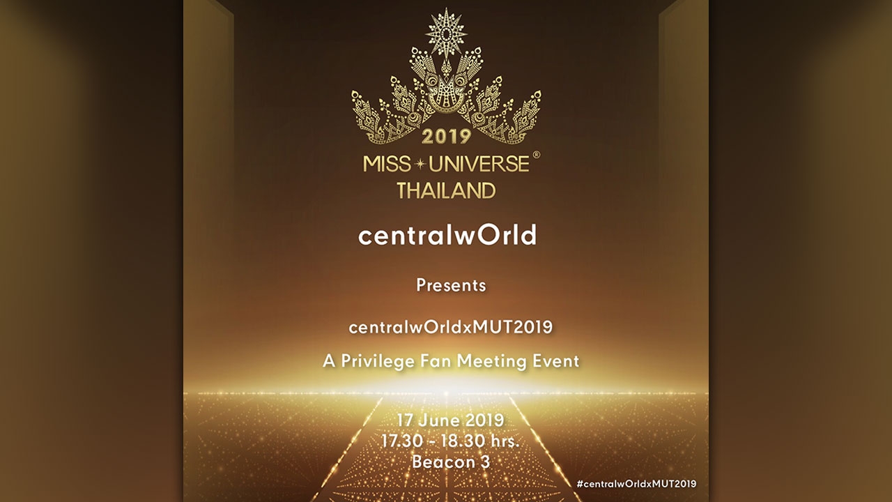 ศูนย์การค้าเซ็นทรัลเวิลด์ ร่วมกับ กองประกวด Miss Thailand Universe 2019 จัดงาน Meet & Greet นางงามผู้ได้รับ Golden Tiara รวมถึงสาวงามผู้เข้าประกวด Miss Universe Thailand 2019 กว่า 30 คน ที่จะมาร่วมทำกิจกรรมพูดคุยให้สัมภาษณ์ พร้อมพบแฟนนางงามอย่างใกล้ชิด ในวันที่ 17 มิถุนายน 2562 เวลา 17.30-18.30 น. ณ ลาน Beacon 3 ชั้น 1 ศูนย์การค้าเซ็นทรัลเวิลด์
