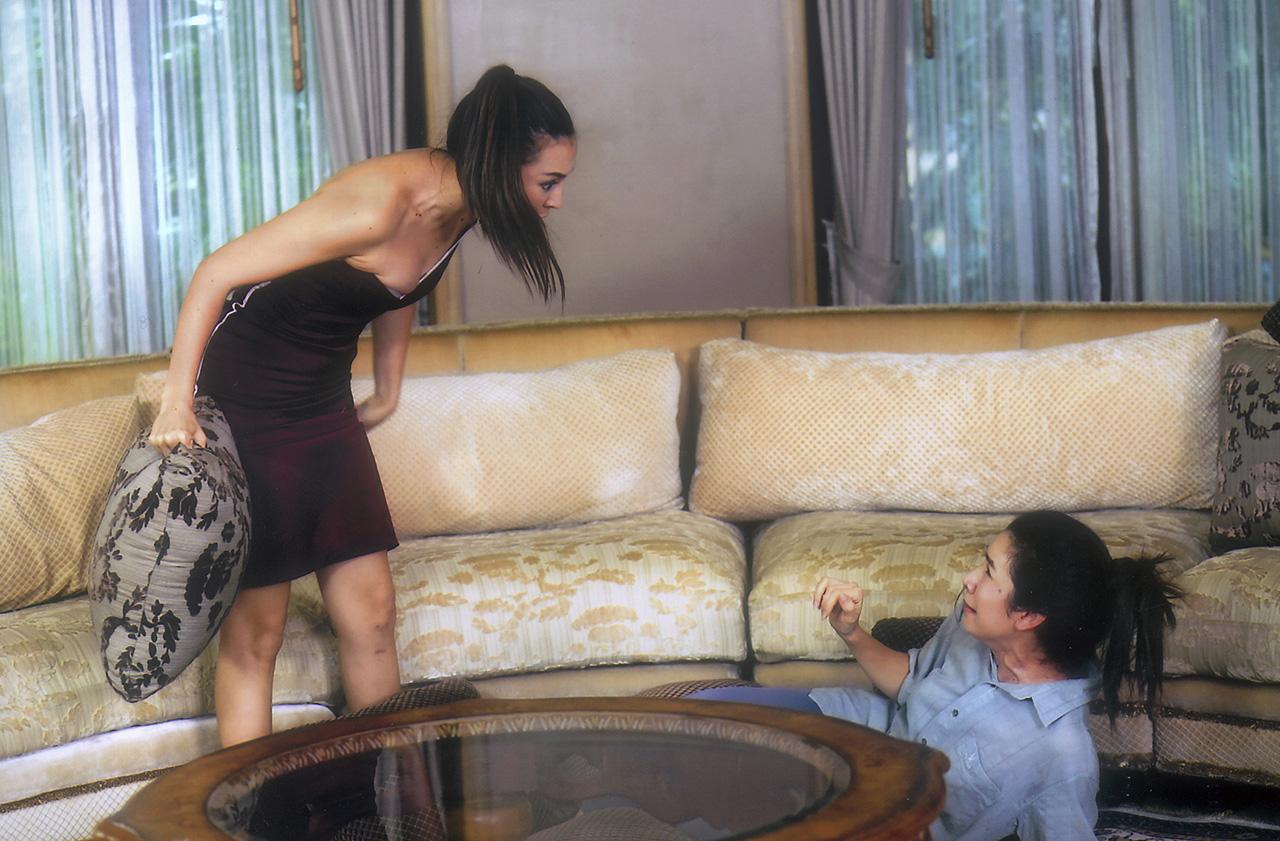 เบื้องหลังการถ่ายทำฉากนี้กองยกไปถ่ายทำที่หมู่บ้านศริญญา บางใหญ่ เป็นฉากที่ นุสบา เมียหลวงโดน คารีสา เมียน้อยเอาคืนคาบ้านตนเอง! เริ่มจากเข้าครัวล้างจาน นุส บอกก็เคยล้างบ้าง แต่พอถึงตอนบีบนวดเนี่ย นุส บอกขนาดบีบนวดให้สามียังไม่เค้ยไม่เคยนะ คารีสา ถือว่ามีบุญจริงๆ ไม่เพียงเท่านั้นบีบนวดให้ไม่พอใจก็ถูกถีบถูกจิกหัวด่าอีกตะหาก ชีวิตไม่เคยตกต่ำเท่านี้มาก่อน แต่ คารีสา ก็ยกมือไหว้ขอโทษทั้งก่อนและก็หลังถ่ายทำเสร็จ