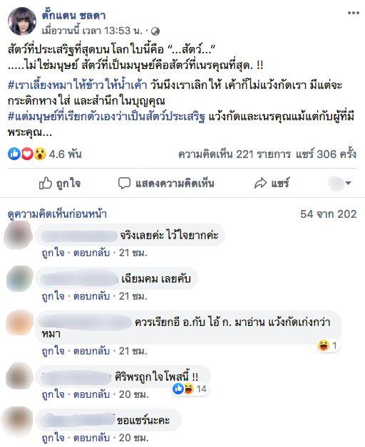โดย ตั๊กแตน โพสต์ข้อความในเฟซบุ๊กส่วนตัวว่า “สัตว์ที่ประเสริฐที่สุดบนโลกใบนี้คือ “...สัตว์...” .....ไม่ใช่มนุษย์ สัตว์ที่เป็นมนุษย์คือสัตว์ที่เนรคุณที่สุด. !! #เราเลี้ยงหมาให้ข้าวให้น้ำเค้า วันนึงเราเลิกให้ เค้าก็ไม่แว้งกัดเรา มีแต่จะกระดิกหางใส่ และสำนึกในบุญคุณ #แต่มนุษย์ที่เรียกตัวเองว่าเป็นสัตว์ประเสริฐ แว้งกัดและเนรคุณแม้แต่กับผู้ที่มีพระคุณ...”