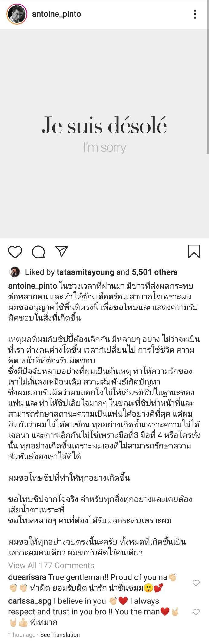 ล่าสุด อองตวน ได้โพสต์ภาพข้อความ Je suis desole I’m Sorry” พร้อมทั้งชี้แจงยาวเหยียดถึงสาเหตุที่ทำให้ต้องเลิกรากับชิปปี้ว่า “ในช่วงเวลาที่ผ่านมา มีข่าวที่ส่งผลกระทบต่อหลายคน และทำให้ต้องเดือดร้อน ลำบากใจเพราะผม ผมขออนุญาตใช้พื้นที่ตรงนี้ เพื่อขอโทษและแสดงความรับผิดชอบในสิ่งที่เกิดขึ้น