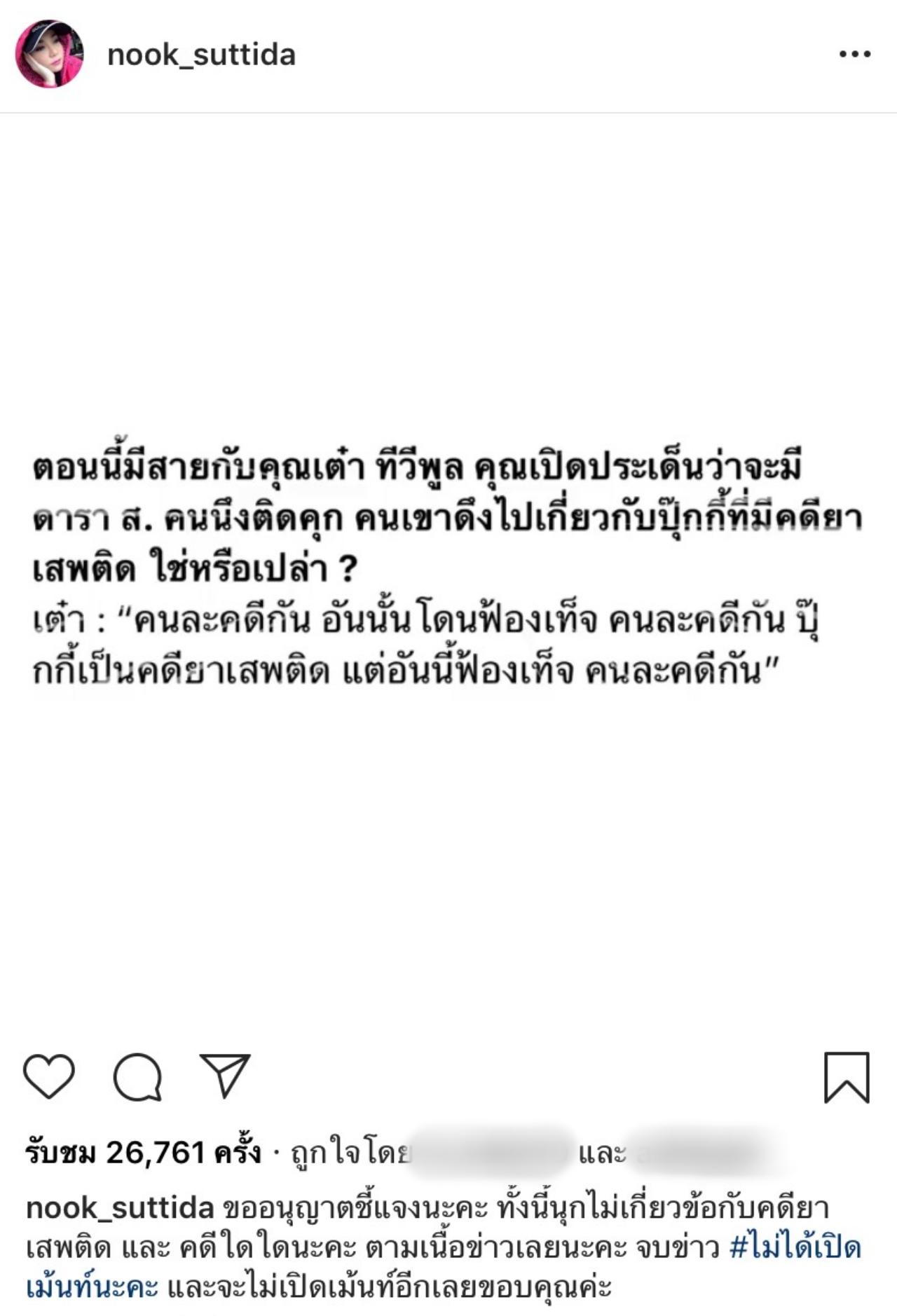 พร้อมแคปชั่นใต้ภาพว่า “ขออนุญาตชี้แจงนะคะ ทั้งนี้นุกไม่เกี่ยวข้องกับคดียาเสพติด และคดีใดใดนะคะ ตามเนื้อข่าวเลยนะคะ จบข่าว” เจ้าตัวออกมาชี้แจงเคลียร์ชัดเจนว่าไม่เกี่ยวข้องกับยาเสพติด แฟนๆ ที่ติดตามคงสบายใจหายห่วง