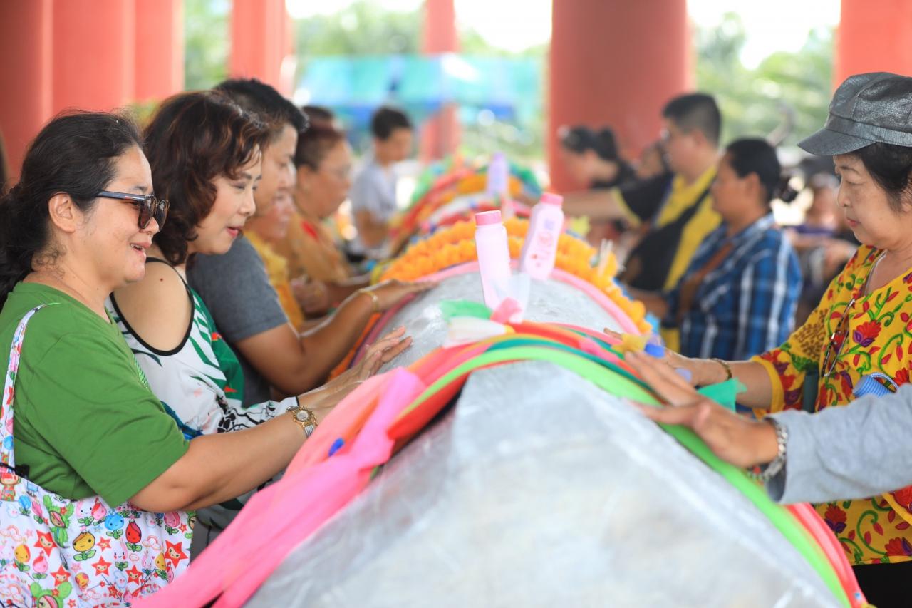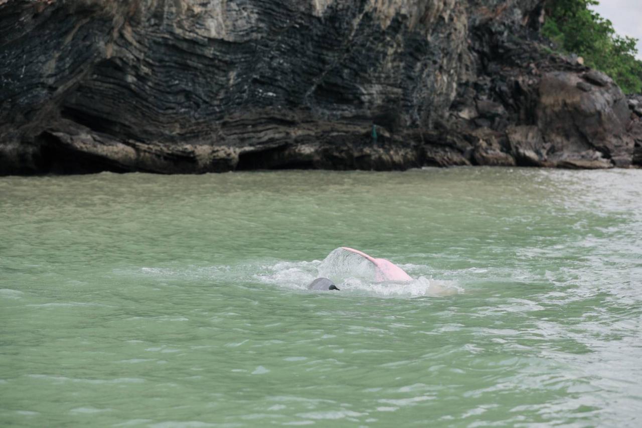 วันที่ 2 ของการท่องเที่ยวเติมพลังแห่งความสุข เริ่มจากการไปชม "โลมาสีชมพู" ณ หาดขนอม ถือเป็นประสบการณ์หาที่อื่นไม่ได้ในประเทศไทย เพราะที่หาดขนอมนี้เป็นแหล่งของโลมาสีชมพูที่อาศัยอยู่ที่นี่ประมาณ 50 ตัว โลมาสีชมพู หรือที่เรียกกันว่าโลมาขาวเทา, โลมาหลังโหนก อาศัยอยู่เฉพาะบริเวณปากแม่น้ำที่มีความอุดมสมบูรณ์ เช่น บริเวณแหลมประทับและอ่าวแขวงเภา หาดขนอม เนื่องจากเป็นแหล่งอาหารที่อุดมสมบูรณ์ จำพวกปลากด กุ้ง ปลาหมึก ลักษณะเด่นของโลมาสีชมพูคือ การมีสีชมพูเฉพาะตัว ในตอนเกิดมีสีเทาเหมือนโลมาทั่วไป แต่เมื่ออายุมากสีขาวเผือกหรือสีชมพูจะเกิดขึ้นจากสีของหลอดเลือดที่ช่วยไม่ให้อุณหภูมิร่างกายสูงจนเกินไป จึงทำให้เห็นเป็นสีชมพู