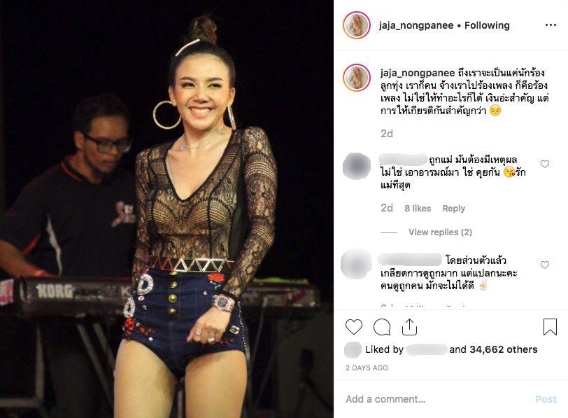 โดย จ๊ะ โพสต์ภาพตัวเองและเขียนข้อความว่า “ถึงเราจะเป็นแค่นักร้องลูกทุ่ง เราก็คน จ้างเราไปร้องเพลง ก็คือร้องเพลง ไม่ใช่ให้ทำอะไรก็ได้ เงินอ่ะสำคัญ แต่การให้เกียรติกันสำคัญกว่า” และมีแฟนๆ เข้ามาคอมเมนต์แสดงความคิดเห็นให้กำลังใจเป็นจำนวนมาก พร้อมทั้งบอกว่าอย่าคิดมาก บ้างก็บอกว่าอาจเป็นเพราะเป็นคนสนุก ใครๆ ก็คิดว่าจะให้เราทำอะไรก็ได้ บางคนก็บอกว่าเกลียดการดูถูกมาก และคนที่ดูถูกคนมักจะไม่ได้ดี ฯลฯ