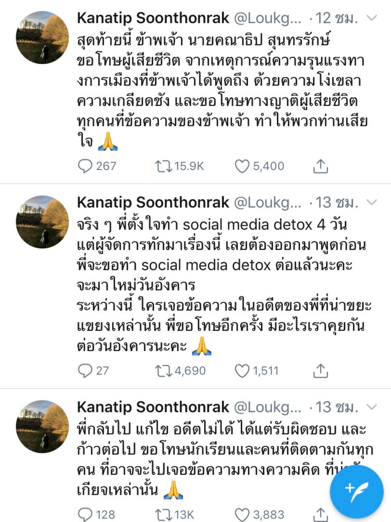 "จริงๆ พี่ตั้งใจทำ social media detox 4 วัน แต่ผู้จัดการทักมาเรื่องนี้ เลยต้องออกมาพูดก่อน พี่จะขอทำ social media detox ต่อแล้วนะคะ จะมาใหม่วันอังคาร ระหว่างนี้ ใครเจอข้อความในอดีตของพี่ที่น่าขยะแขยงเหล่านั้น พี่ขอโทษอีกครั้ง มีอะไรเราคุยกันต่อวันอังคารนะคะ”