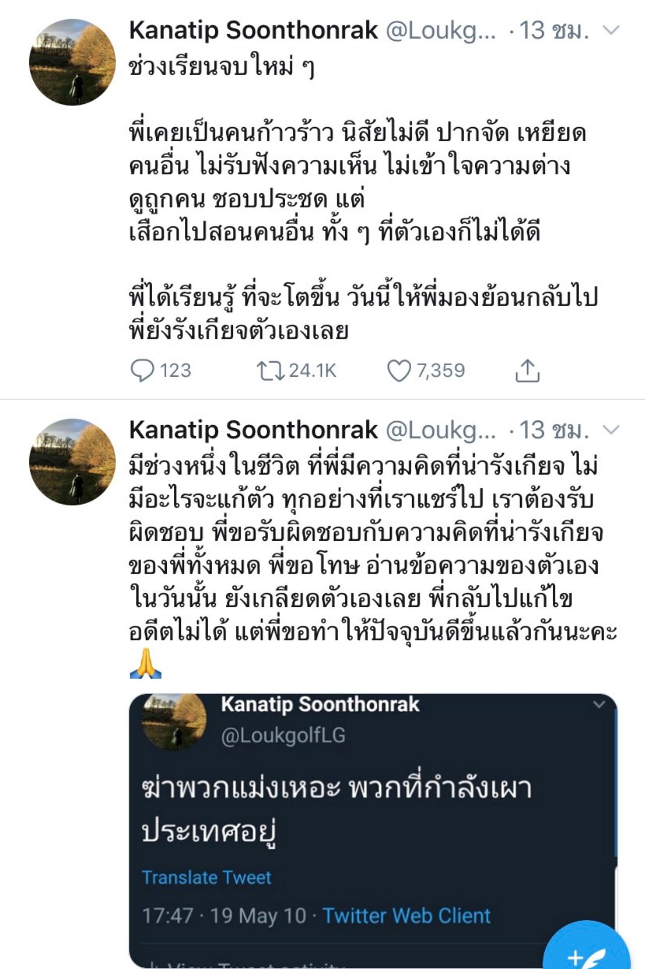หลังจากที่ถูกชาวโซเชียล ขุดอดีตในทวิตเตอร์ของคุณครูลูกกอล์ฟ คณาธิป สุนทรรักษ์ เจ้าของสถาบันสอนภาษา และยังเป็นดีเจจัดรายการ พุธทอล์คพุธโธ นำมาแฉในโลโซเชียล ซึ่งเป็นเรื่องเกี่ยวกับการเมืองออกมาแฉ ล่าสุด เจ้าตัวก็ได้ทวีตข้อความเพื่อขอโทษผ่านทางทวิตเตอร์ส่วนตัวของตัวเอง โดยคุณครูลูกกอล์ฟชี้แจงว่า