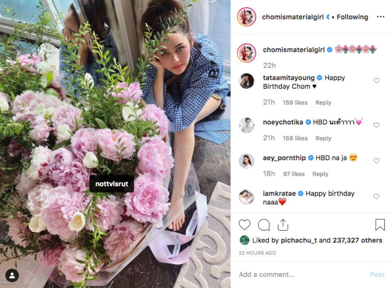 โดยเมื่อวันที่ 28 มิ.ย. 2562 ที่ผ่านมา ซึ่งตรงกับวันคล้ายวันเกิดของชมพู่ เจ้าตัวก็ได้โพสต์ภาพช่อดอกไม้ดังกล่าวและแท็กไปที่ไอจีของน็อต รวมไปถึงภาพที่ลูกแฝดตัวน้อย น้องสายฟ้า-น้องพายุ กับช่อดอกไม้ใหญ่ งานนี้แฟนๆ หลายคนอดเอ็นดูในความน่ารักของหนุ่มน้อยไม่ได้ เพราะช่อดอกไม้ใหญ่ซะจนบังตัวหนุ่มน้อยแทบมิดเลยทีเดียว อีกทั้งยังแซวความหวานของหนุ่มน็อต ที่ไม่ว่าเวลาจะผ่านไปแค่ไหน ยังคงรักและดูแลสาวชมเป็นอย่างดี