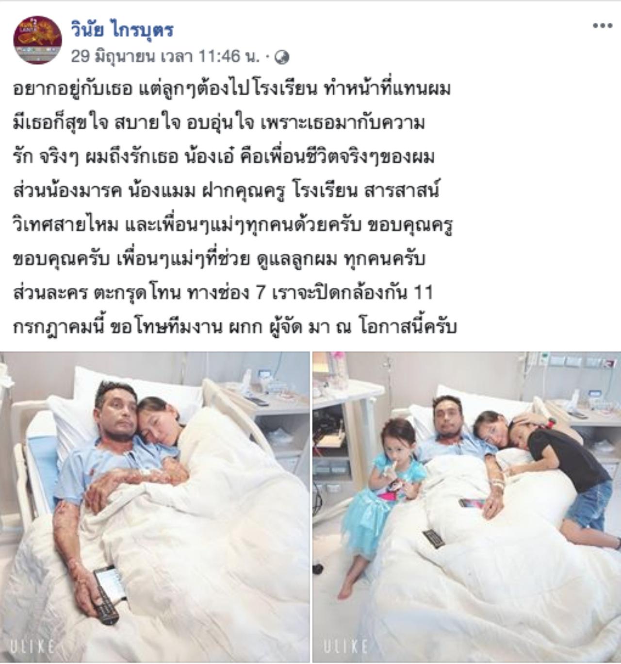 แม้ตอนนี้จะได้คุณหมอเฉพาะทางดูแล แต่ก็ยังไม่หายขาดดี เพราะต้องใช้เวลาในการรักษา และตอนนี้ เมฆ วินัย ก็ได้เข้าโรงพยาบาลอีกครั้ง และงานนี้เจ้าตัวก็ได้โพสต์ข้อความสุดซึ้งถึงภรรยาของตนเองผ่านทางเฟซบุ๊กส่วนตัว โดยมีข้อความดังนี้