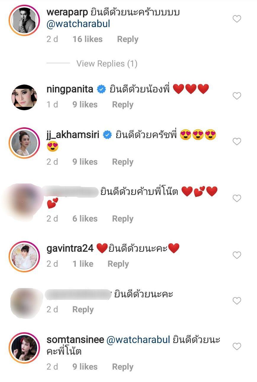 หลังจากนั้นก็มีแฟนๆ ตลอดจนเพื่อนๆ ในวงการบันเทิง อาทิ วี วีรภาพ, หนิง ปณิตา, จั๊กจั่น อคัมย์สิริ, แก้ม กวินตรา, ส้ม ธัญสินี, ธีร์ วณิชนันทธาดา, ทับทิม อัญรินทร์, ฝ้า ณิชานันท์, บิ๊กเอ็ม กฤตฤทธิ์, อัค อัครัฐ, ตาล กัญญา, เอส กันตพงศ์, หยก ธัญยกันต์, แอม พีรวัศ, ทราย เจริญปุระ ฯลฯ เข้ามาคอมเมนต์แสดงความยินดี บันเทิงไทยรัฐออนไลน์ขอแสดงความยินดีด้วยนะคะ.