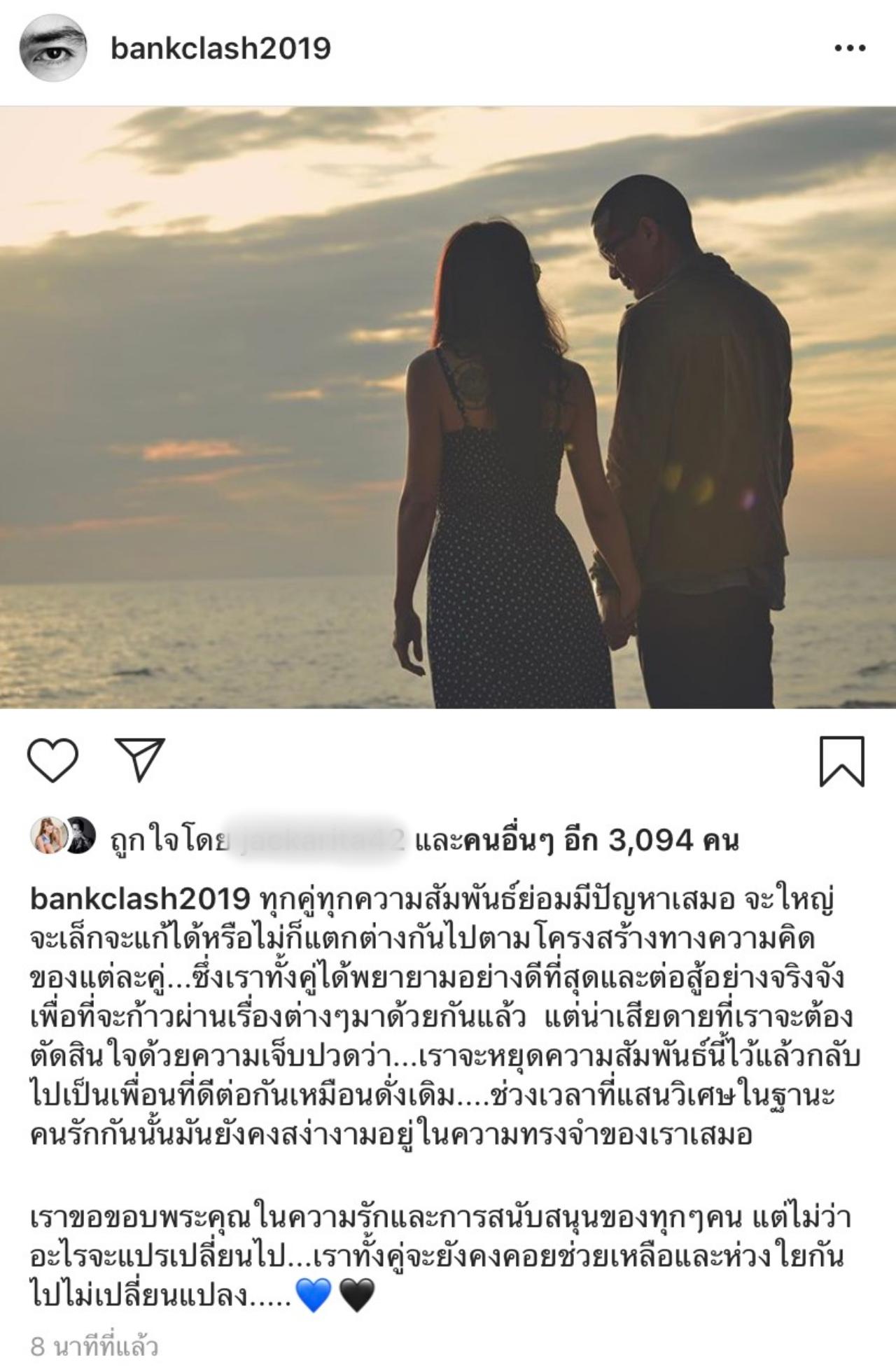 หลังจากที่ชาวเน็ตจับพิรุธความสัมพันธ์ของ แบงค์ ปรีติ และ โอซา แวง ว่าในระยะหลังๆ ทั้งคู่ไม่ค่อยลงรูปคู่หวานๆ เหมือนเช่นเคย แต่ก็ไม่มีฝ่ายใดมาให้คำตอบกับเรื่องนี้ จนกระทั่งในวันนี้ แบงค์ และ โอซา แวง ได้พร้อมใจกันประกาศสถานะของทั้งคู่ให้ได้ทราบโดยพร้อมเพรียงกัน โดยมีเนื้อหาดังนี้