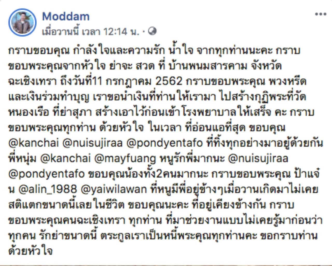 "กราบขอบคุณ กำลังใจและความรัก นำ้ใจ จากทุกท่านนะคะ กราบขอบพระคุณจากหัวใจ ย่าจะสวดที่บ้านพนมสารคาม จังหวัดฉะเชิงเทรา ถึงวันที่ 11 กรกฎาคม 2562 กราบขอบพระคุณ พวงหรีดและเงินร่วมทำบุญ เราขอนำเงินที่ท่านให้เรามาไปสร้างกุฏิพระที่วัดหนองเรือ ที่ย่าสุภาสร้างเอาไว้ก่อนเข้าโรงพยาบาลให้เสร็จคะ กราบขอบพระคุณทุกท่านด้วยหัวใจ ในเวลาที่อ่อนแอที่สุด ขอบคุณ @kanchai @nuisujiraa @pondyentafo ที่ทิ้งทุกอย่างมาอยู่ด้วยกัน พี่หนุ่ม @kanchai @mayfuang หนูรักพี่มากนะ @nuisujiraa @pondyentafo ขอบคุณน้องทั้ง2คนมากนะ กราบขอบพระคุณ ป้าแจ๋น @alin_1988 @yaiwilawan ที่หนูมีพี่อยู่ข้างๆเมื่อวานเกิดมาไม่เคยสติแตกขนาดนี้เลยในชีวิต ขอบคุณนะคะ ที่อยู่เคียงข้างกัน กราบขอบพระคุณคนฉะเชิงเทราทุกท่านที่มาช่วยงานแบบไม่เคยรู้มาก่อนว่าทุกคน รักย่าขนาดนี้ ตระกูลเราเป็นหนี้พระคุณทุกท่านคะ ขอกราบท่านด้วยหัวใจ".