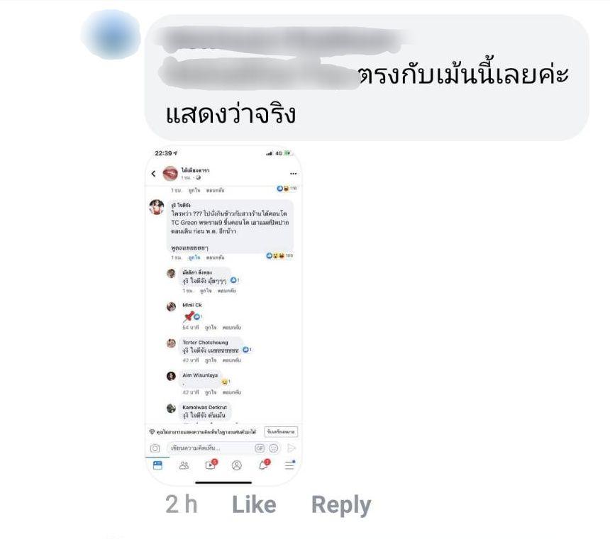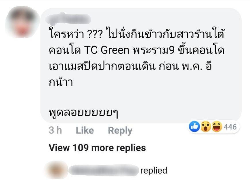 ล่าสุดเพจบันเทิงดัง ใต้เตียงดารา ได้แชร์ข่าวดังกล่าว โดยมีชาวเน็ตเข้าไปแสดงความคิดเห็นเป็นจำนวนมาก ซึ่งมีทั้งคนที่เชื่อและไม่เชื่อ แต่ที่ทำให้ชาวเน็ตขาเผือกสะดุดตาเห็นจะเป็นคอมเมนต์จากชาวเน็ตคนหนึ่งว่า “ใครหว่า ??? ไปนั่งกินข้าวกับสาวร้านใต้คอนโด TC Green พระราม 9 ขึ้นคอนโด เอาแมสปิดปากตอนเดิน ก่อน พ.ค. อีกน้าา พูดลอยยยยยๆ”