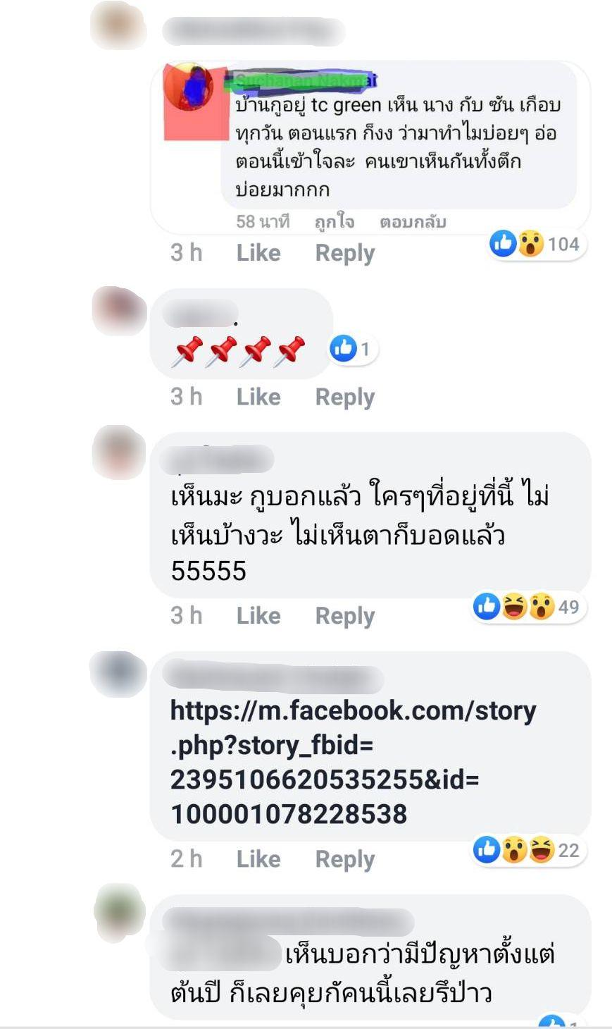 จากนั้นมีชาวเน็ตคนอื่นเข้ามาคอมเมนต์ทำนองว่าบ้านตนก็อยู่คอนโดเดียวกัน เห็นนางกับซันเกือบทุกวัน ตอนแรกก็งงว่ามาทำไมบ่อยๆ ตอนนี้เข้าใจแล้ว คนเขาเห็นกันทั้งตึก บ้างก็บอกว่าเห็นที่คอนโดเดียวกันมาตั้งแต่หลายเดือนก่อน ก็ไม่คิดว่าจะเป็นข่าว เลยไม่ได้ถ่ายรูปเอาไว้ เห็นด้วยตาเปล่า 2 ครั้งคงพูดยากซินะ ฯลฯ แต่เรื่องจริงจะเป็นยังไง คงต้องถามจากปากของซันจะดีกว่า.