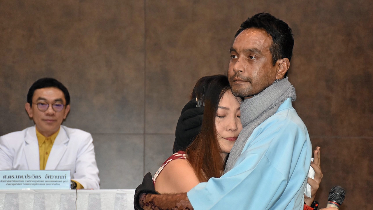เอ๋-ชลรดา แสนสินรังษี ภรรยาเมฆ-วินัย ไกรบุตร โอบกอดสามีให้กำลังใจระหว่างแพทย์จุฬาฯแถลงอาการป่วยของเมฆว่าเป็นโรคตุ่มน้ำพองที่เกิดจากภูมิในร่างกายเพี้ยน ตอนนี้อาการดีขึ้นแล้ว ส่วนการรักษาต้องประเมินเป็นระยะ ขณะที่เมฆ-วินัยกล่าวขอบคุณทุกกำลังใจจากแฟนคลับที่ส่งมาให้.