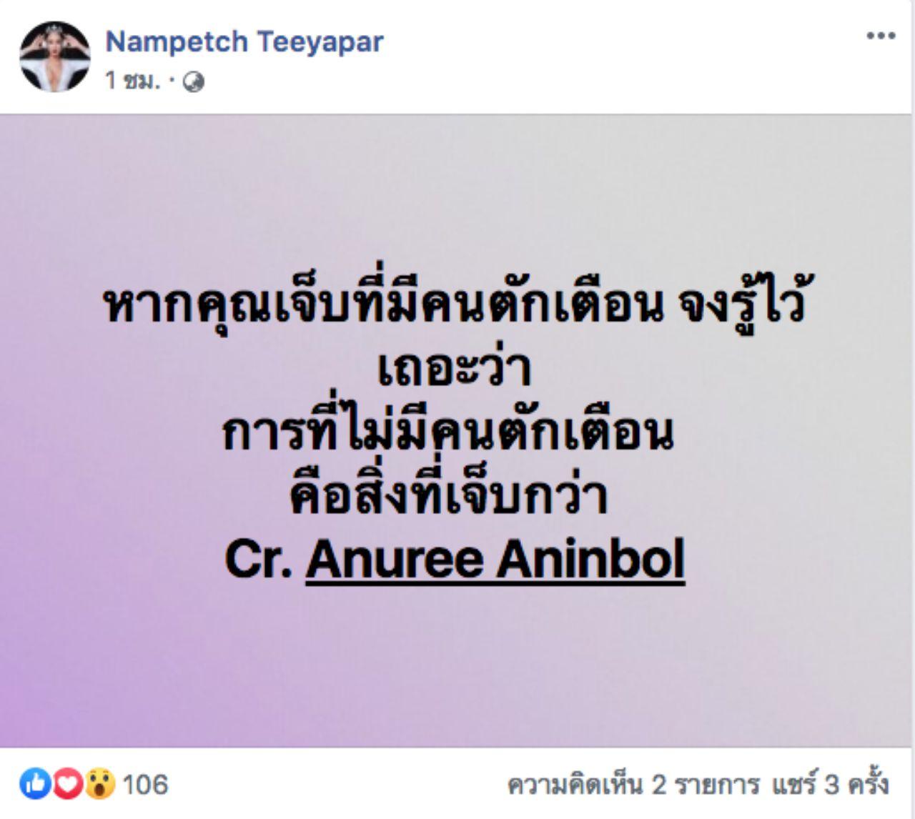 เท่านั้นยังไม่พอ น้ำเพชรยังโพสต์ข้อความเพิ่มเติมอีกว่า “หากคุณเจ็บที่มีคนตักเตือน จงรู้ไว้เถอะว่า การที่ไม่มีคนตักเตือน คือสิ่งที่เจ็บกว่า” โดยมีแฟนๆ นางงามต่างเข้ามาแสดงความคิดเห็นหลายคน พร้อมทั้งชื่นชมกับความคิดของน้ำเพชรว่าตอบยังไงให้มงลงให้มาดูตรงนี้ บ้างก็เชียร์ให้เจ้าตัวคว้ามงกุฎจากการประกวดมิสเอิร์ธ 2019 ให้ได้ด้วย.