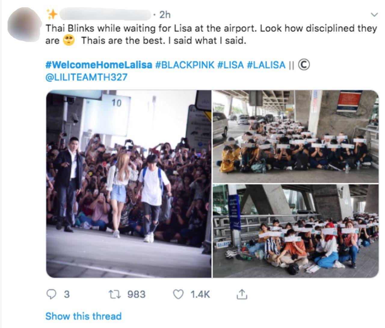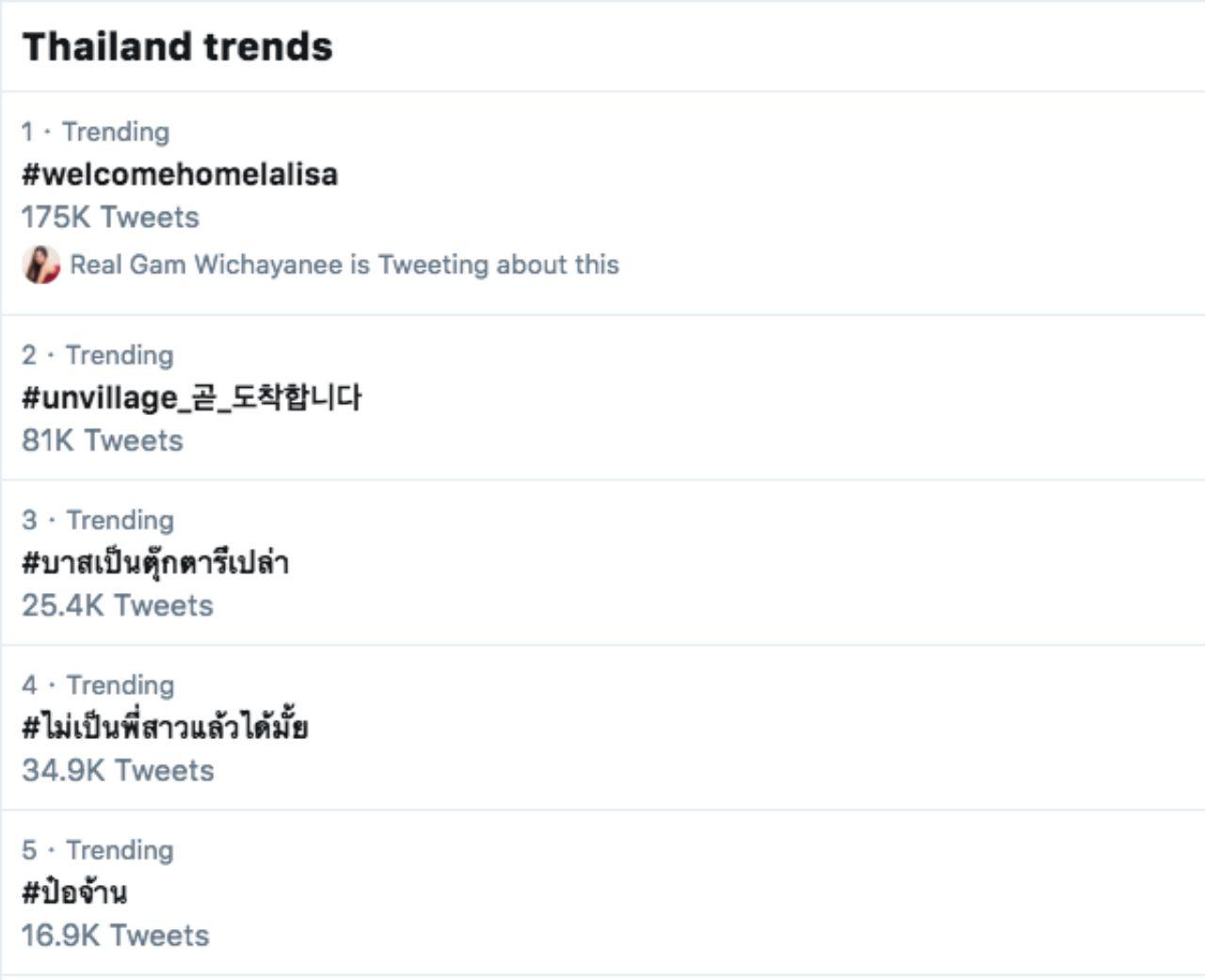จากเหตุการณ์ดังกล่าวก็มีแฟนๆ ได้ทวีตภาพและคลิปของลิซ่าที่สนามบิน ตลอดจนภาพบรรยากาศของแฟนคลับที่มารอคอยเป็นจำนวนมาก ส่งผลให้แฮชแท็ก #welcomehomelalisa ขึ้นเทรนด์ทวิตเตอร์อันดับ 1 ในเวลานี้.