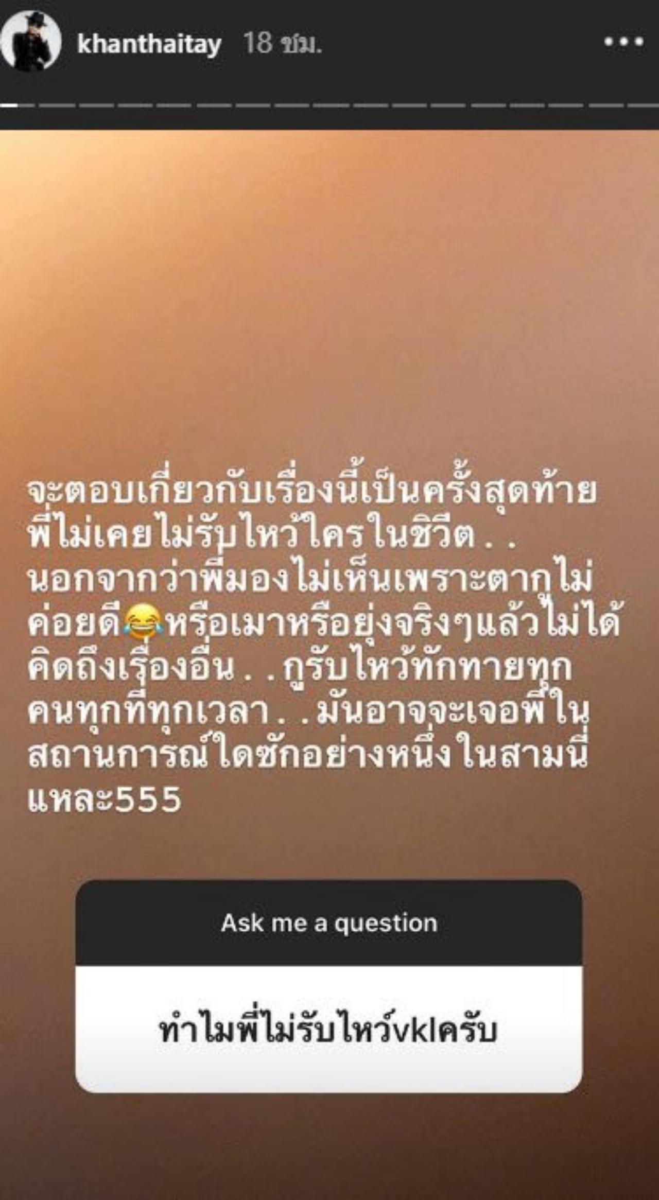 “จะตอบเกี่ยวกับเรื่องนี้เป็นครั้งสุดท้าย พี่ไม่เคยไม่รับไหว้ใครในชีวิต.. นอกจากว่าพี่มองไม่เห็นหรือตากูไม่ค่อยดี หรือเมาหรือยุ่งจริงๆ แล้วไม่ได้คิดถึงเรื่องอื่น..กูรับไหว้ทักทายทุกคนทุกที่ทุกเวลา..มันอาจจะเจอพี่ในสถานการณ์ใดสักอย่างหนึ่งในสามนี่แหละ 555”
