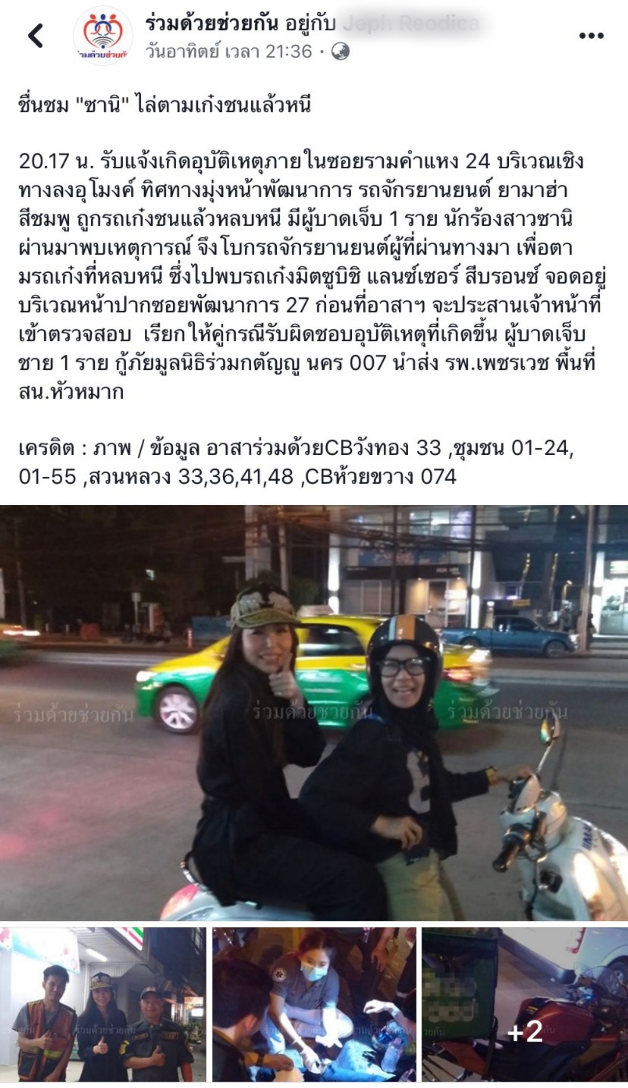 หลังจากที่ชาวเน็ตแห่ชื่นชม ซานิ นิภาภรณ์ ฐิติธนการ หรือ ซานิ เอเอฟ นักร้อง-นักแสดงหญิงชื่อดัง ที่เพจร่วมด้วยช่วยกัน ได้นำภาพของนักร้องสาวที่ไปช่วยตามคนขับรถเก่งที่ชนมอเตอร์ไซค์ล้มจนได้รับบาดเจ็บมารับผิดชอบคู่กรณี โพสต์ลงในเพจ ล่าสุด ซานิได้เปิดเผยถึงนาทีที่ตัดสินใจทิ้งรถแล้วนั่งซ้อนมอเตอร์ไซค์ไปตามคู่กรณีให้มารับผิดชอบ โดยเจ้าตัวเปิดเผยว่า