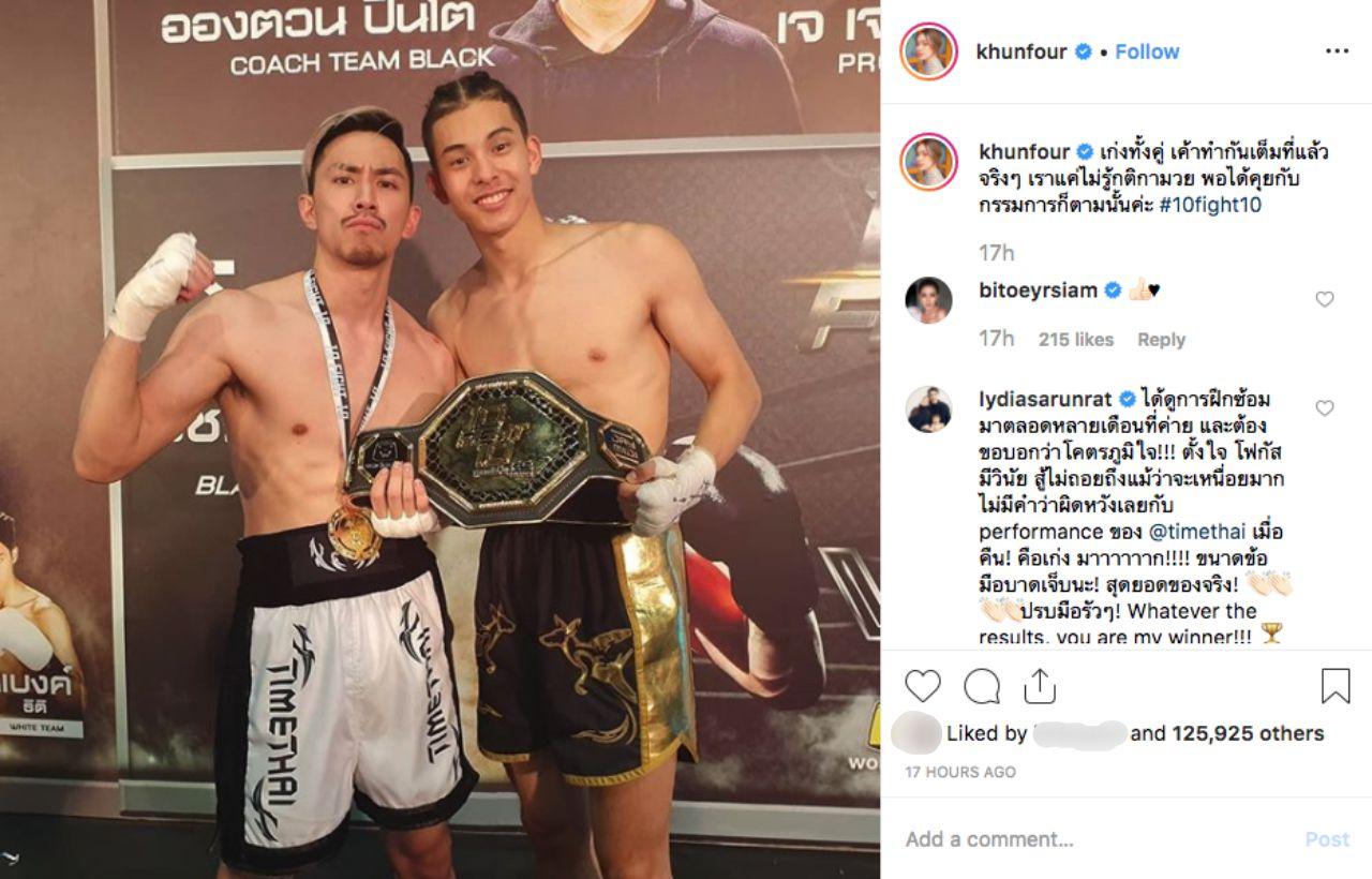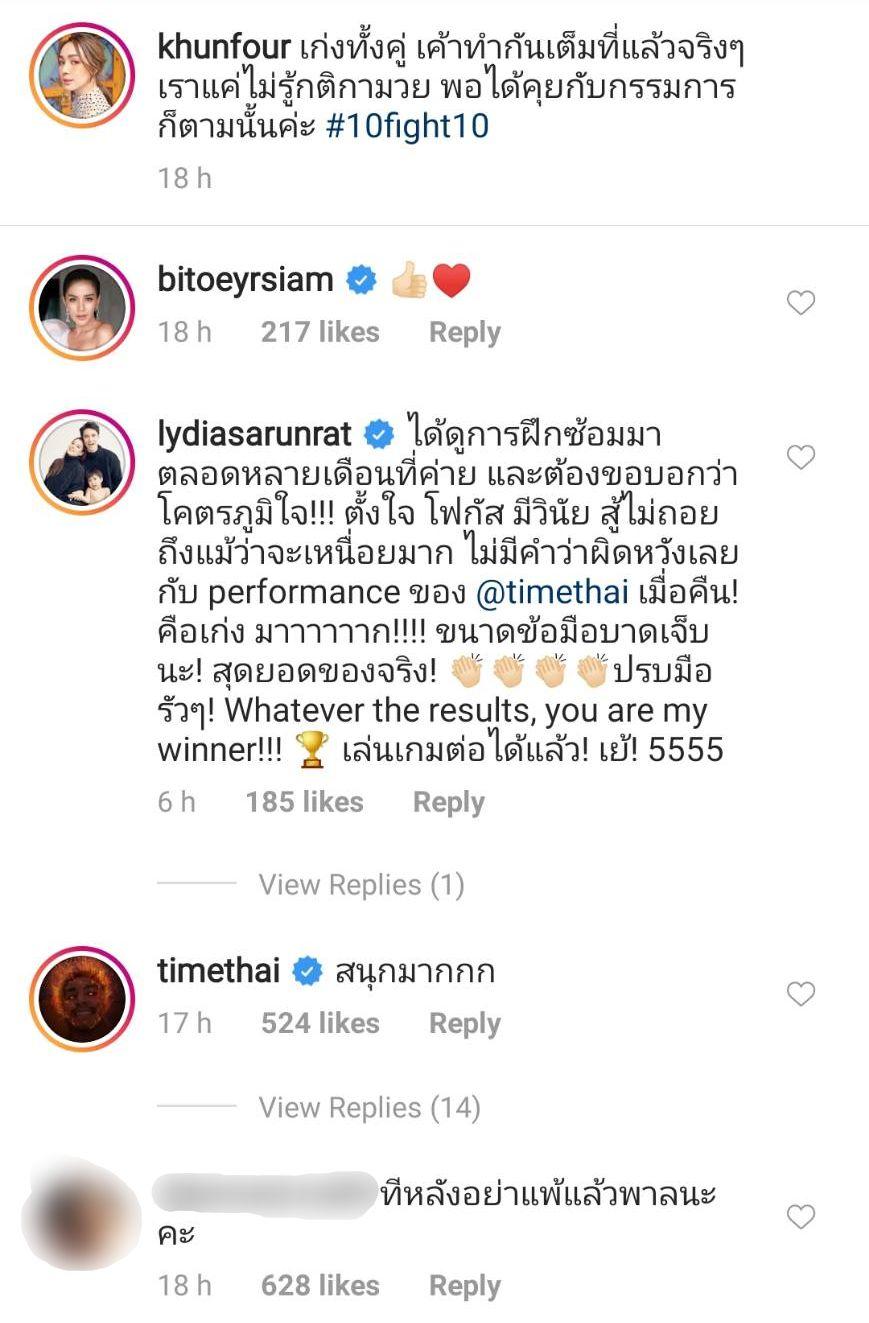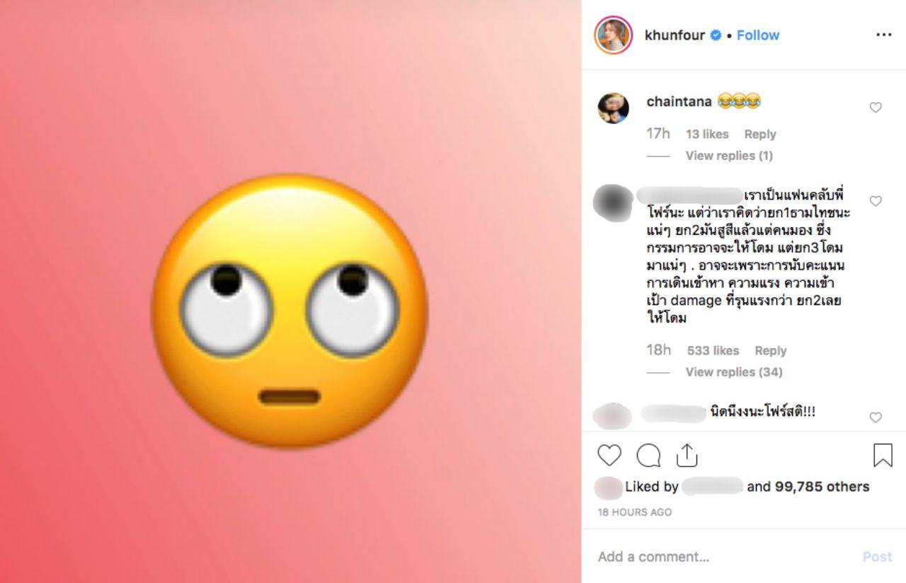 แต่ล่าสุดโฟร์โพสต์ภาพธามไทและโดมพร้อมทั้งเขียนข้อความว่า “เก่งทั้งคู่ เค้าทำกันเต็มที่แล้วจริงๆ เราแค่ไม่รู้กติกามวย พอได้คุยกับกรรมการก็ตามนั้นค่ะ #10fight10” โดยมีบรรดาคนบันเทิงให้กำลังใจหลายคน อาทิ ใบเตย อาร์สยาม, ลีเดีย ศรัณย์รัชต์, ซัน ประชากร, อองตวน ปินโต ฯลฯ ด้านธามไทเองก็คอมเมนต์ในภาพดังกล่าวว่า “สนุกมากกก” นอกจากนี้ก็มีชาวเน็ตบางส่วนที่เข้ามาให้กำลังใจ แต่ก็มีหลายคนที่ยังคงเข้ามาวิพากษ์วิจารณ์ถึงเรื่องที่โฟร์โพสต์ภาพมองบนก่อนหน้านี้ด้วยคำพูดรุนแรงด้วย.