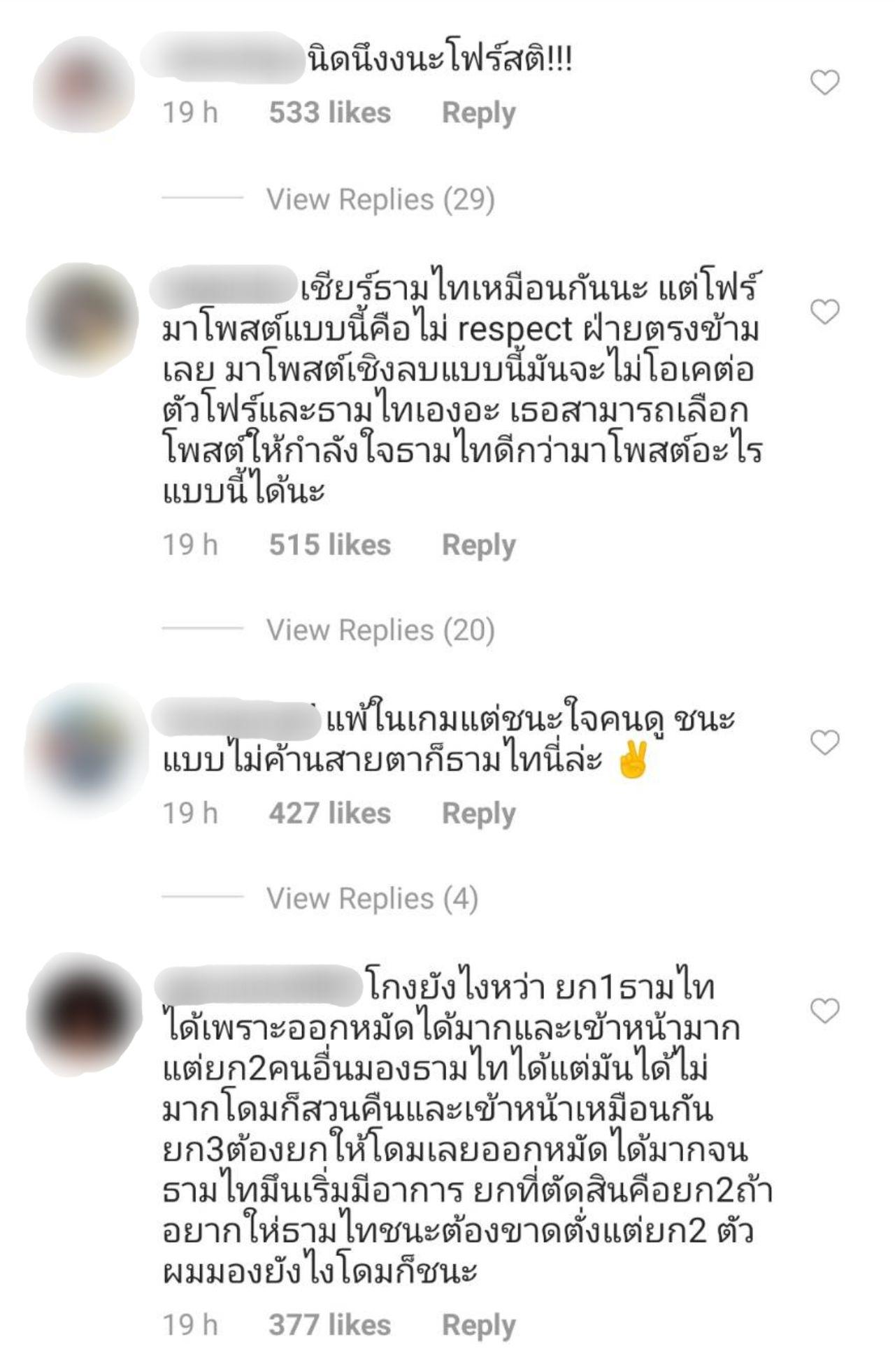 หลังจากนั้นดราม่าบังเกิดเมื่อนักร้องนักแสดงสาว โฟร์ ศกลรัตน์ วรอุไร สาวคนสนิทที่ไปเชียร์ธามไทโพสต์ภาพอิโมติคอนมองบน งานนี้เลยมีชาวเน็ตหลายคนที่เห็นด้วยต่างก็เข้ามาให้กำลังใจ พร้อมทั้งมองว่าธามไทควรเป็นฝ่ายชนะมากกว่า แต่ก็มีชาวเน็ตอีกหลายคนที่ไม่เห็นด้วย พร้อมทั้งต่อว่าโฟร์ไม่ยอมรับกติกา แพ้แล้วพาล ไม่ยอมรับความจริง ฯลฯ