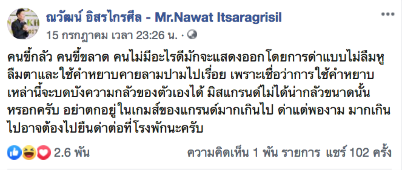 ณวัฒน์ ได้โพสต์เฟซบุ๊กเตือน ไปถึงพวกด่าเก่งไว้แล้ว "คนขี้กลัว คนขี้ขลาด คนไม่มีอะไรดี มักจะแสดงออกโดยการด่าแบบไม่ลืมหูลืมตา และใช้คำหยาบคายลามปามไปเรื่อย เพราะเชื่อว่าการใช้คำหยาบเหล่านี้ จะบดบังความกลัวของตัวเองได้ มิสแกรนด์ไม่ได้น่ากลัวขนาดนั้นหรอกครับ อย่าตกอยู่ในเกมของแกรนด์มากเกินไป ด่าแต่พองาม มากเกินไปอาจต้องไปยืนด่าต่อที่โรงพักนะครับ".